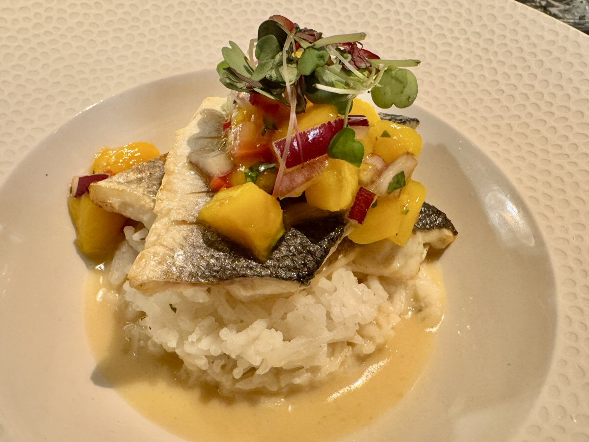 Our second course was pan-seared Sea Bass with Sticky Rice, a fragrant Thai Coconut Broth, Mango and Coriander Salsa and Pickled Ginger. The fish was gorgeously moist and soft, with a lightly crisped skin, and the delicately fragrant broth enhanced it superbly. You can’t beat good Sticky Rice, and this was great – especially when eaten with the other elements of the dish; its floury comfort adding a velvety hint in the mouth. Ramping up the flavour factor was a seriously good Mango and Coriander Salsa; this really got the taste bud’s attention.