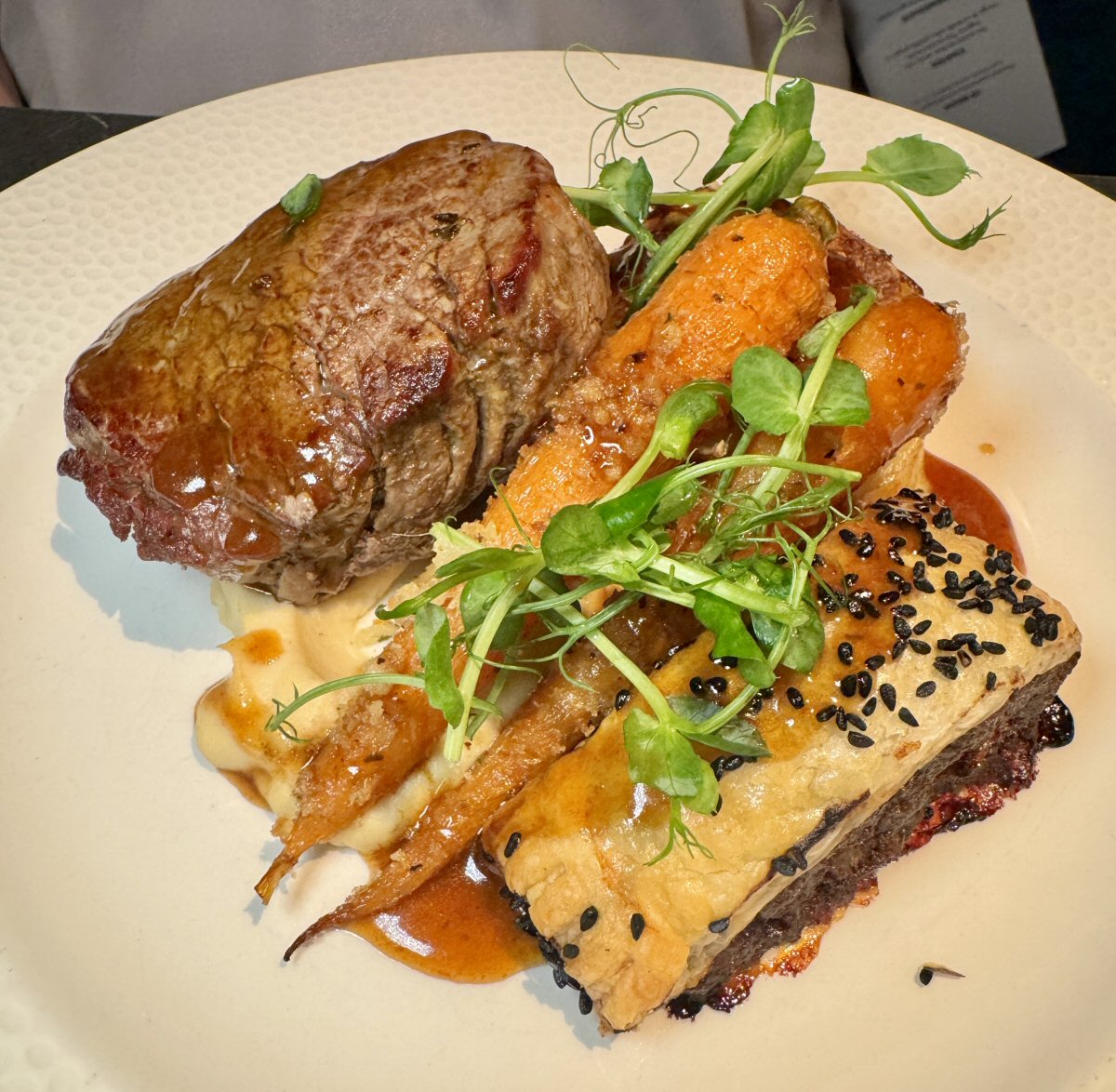 For mains, Chef served Roasted Fillet of Beef (medium-rare), Braised Shin and Caramelised Onion Wellington slice, Dauphinoise Potato rounds, Beef-fat Carrots, Celeriac Purée, and pan-jus, accompanied by Seasonal Vegetables. Let me just say that Chef doesn’t muck about: if he’s serving you a Beef Fillet, you’re going to know you’re eating it! I have to confess that, despite my restraint with the Canapés, I couldn’t finish the Fillet, delicious though it was.
