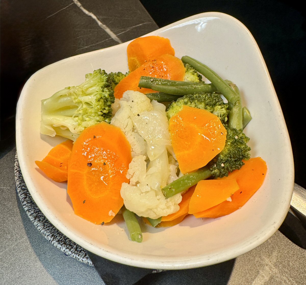 Thankfully, the Wellington wasn’t an entire one, rather it was an inch-thick slice of a bigger whole; this morsel was marvellous, the Shin was beyond tender and intensely tasty, the sweetened, soft Caramelised Onion providing the interim layer between the meat and pastry. I was beyond pleased to discover that the pastry wasn’t soggy; bravo, Chef. Nicely softened, the whole baby Carrots carried the unmistakeable meaty note of the Beef fat that they’d cooked in, contrasting them with the [nicely al dente] Carrots that came with the Green Beans, Cauliflower and Broccoli in a separate dish.