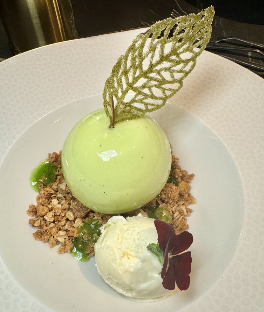 Obviously, we were pretty much stuffed at this point but the sight of the catwalk-worthy White Chocolate and Apple Cheesecake with Oat Crumble and Bramley Apple Gel re-ignited our appetite! If you didn’t know better, you would honestly think you were about to tuck into some sort of trendy, cultivated Apple variety. Before us, the most exquisite ‘Apple’ (complete with Cinnamon-zhuzhed skeleton ‘Leaf’) sat waiting to be savoured, which we did after silently applauding the skill of the person who’d made it. Under the pastel green ‘skin’ outer lay a pale White Chocolate Cheesecake ‘body’ that had a secret of its own to reveal; when cut into, teeny-tiny pieces of softened [actual] Apple peeked shyly from their confines. Where the Cheesecake was soft and delicate, the golden-hued Oat Crumble was crunchy and nutty-tasting, partnered with a zingy Bramley Apple Gel whose verdancy added an injection of colour as well.