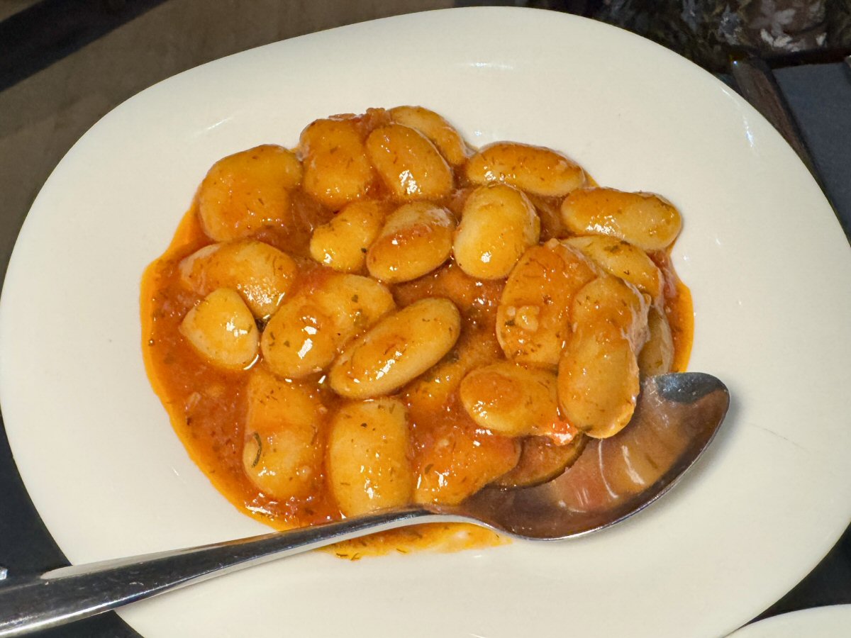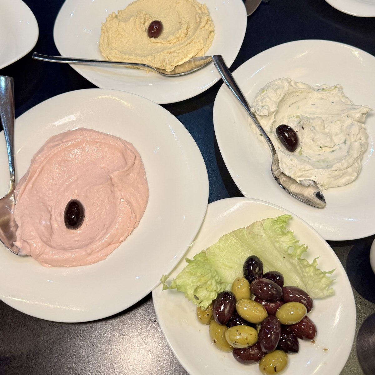 A lovely young lad got us seated and settled, then got us sorted with a bottle of wine (either Pinot Grigio or Sauv Blanc, I can’t remember which, £28.95) and some table water. Given the simplicity of our food order, we weren’t waiting at all long for the first morsels to arrive: Taramosalata, Tzatziki, Houmus, Spanakopita, Halloumi, Kalamari, Fasulia, Olives, and lots of warmed flatbread. We were on a fairly decent-sized, round, 4-seater table, but a Lazy Susan was sorely needed for this plethora of dishes.