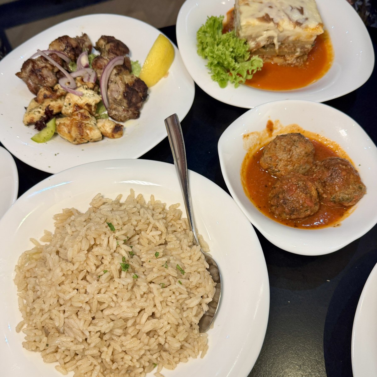 Our empty bowls and side plates were taken away, and fresh napkins, cutlery, and plates set in front of us in readiness for the main course dishes. At El Greco they serve a superb range of dishes, but there were all the crowd-pleasers on our Mezze/Feast menu: Moussaka, Stifado, Keftedes, Loukanika, Dolmades, Chicken- and Pork- Souvlaki, with Oregano-pimped Chips, Rice, and Greek Salad to pair with them.
