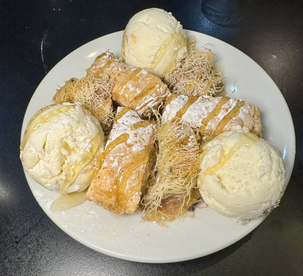 The three of us slumped back in our seats as we concluded our mains, mindful that the Greeks are partial to their syrup- and honey- laden sweet treats. Both Kataifi and Baklava have Filo Pastry at their hearts, as well as nuts, but the difference is in the texture of the Filo. Kataifi is shredded, noodle-like strands of the pastry filled with nuts, whereas Baklava utilises sheets of the pastry that is layered with nuts and drenched in syrup or honey. Both desserts are super-sweet, and were ably assisted in their waist-expanding mission by an impossibly good Honeycomb Ice cream!