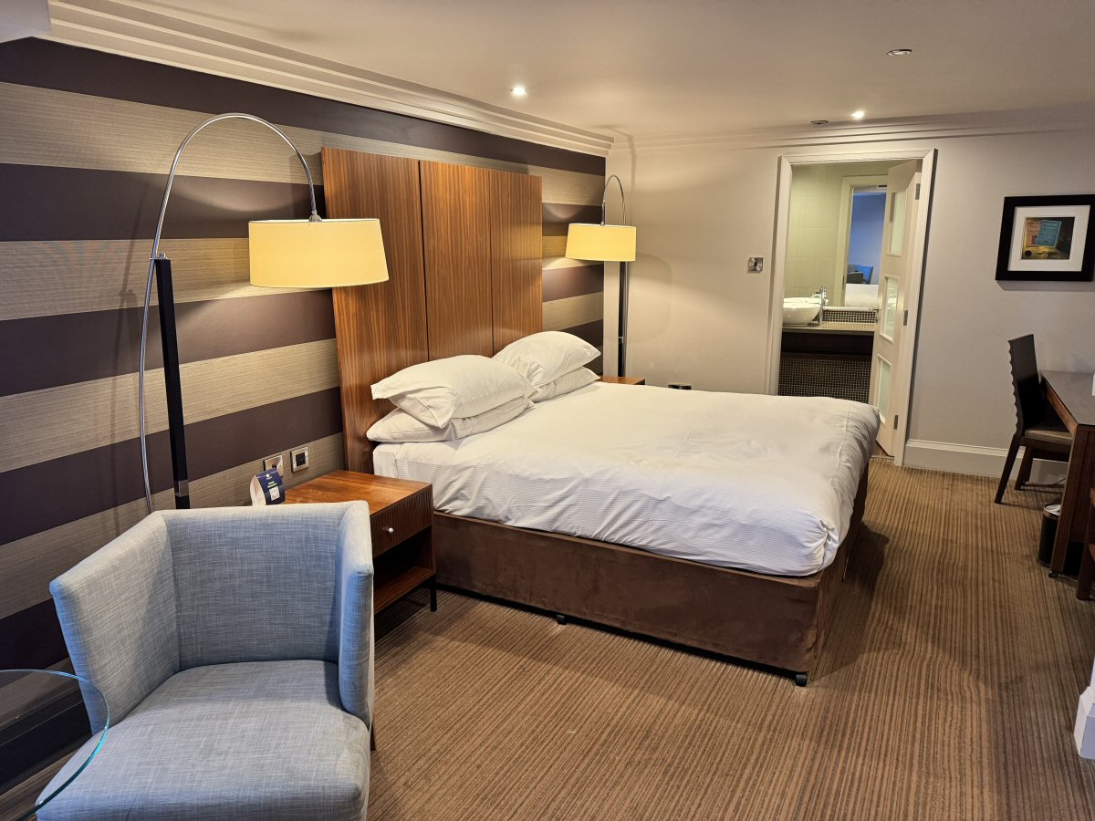 Mummy was more than happy when she clapped eyes on the sizeable twin bed, table and chairs, writing desk, and huge shower/wet room with all the toiletries provided. His Nibs and I were a floor up, in a similar sized room, although ours was ‘thinner and longer’; we had a king-sized bed, table and chairs, writing desk, and shower-over-bath – again with all toiletries provided. Both rooms had an amply stocked hostess tray, kettle, hairdryer, and safe in them, too. Prices for two nights including breakfast were £304.95 and £369.55 respectively (we had our Hilton Honors discount included in this).