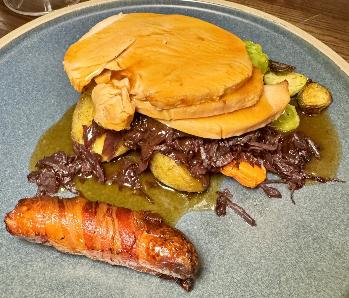 Anyhow, back to the food: for mains, Mummy had the Turkey and trimmings, I plumped for the Braised Pork Ossobuco, and The Man Bird fancied the sound of the slow-cooked Beef Shin. Before long, our server was carefully placing the fully-loaded plates in front of us, bidding us to enjoy; given the sight, I think it safe to say we would. With the photos taken, and me cutting up the Turkey (which was ridiculously soft and tender, by the way) and the Pig-in-Blanket for Mummy, we all enthusiastically dug in.