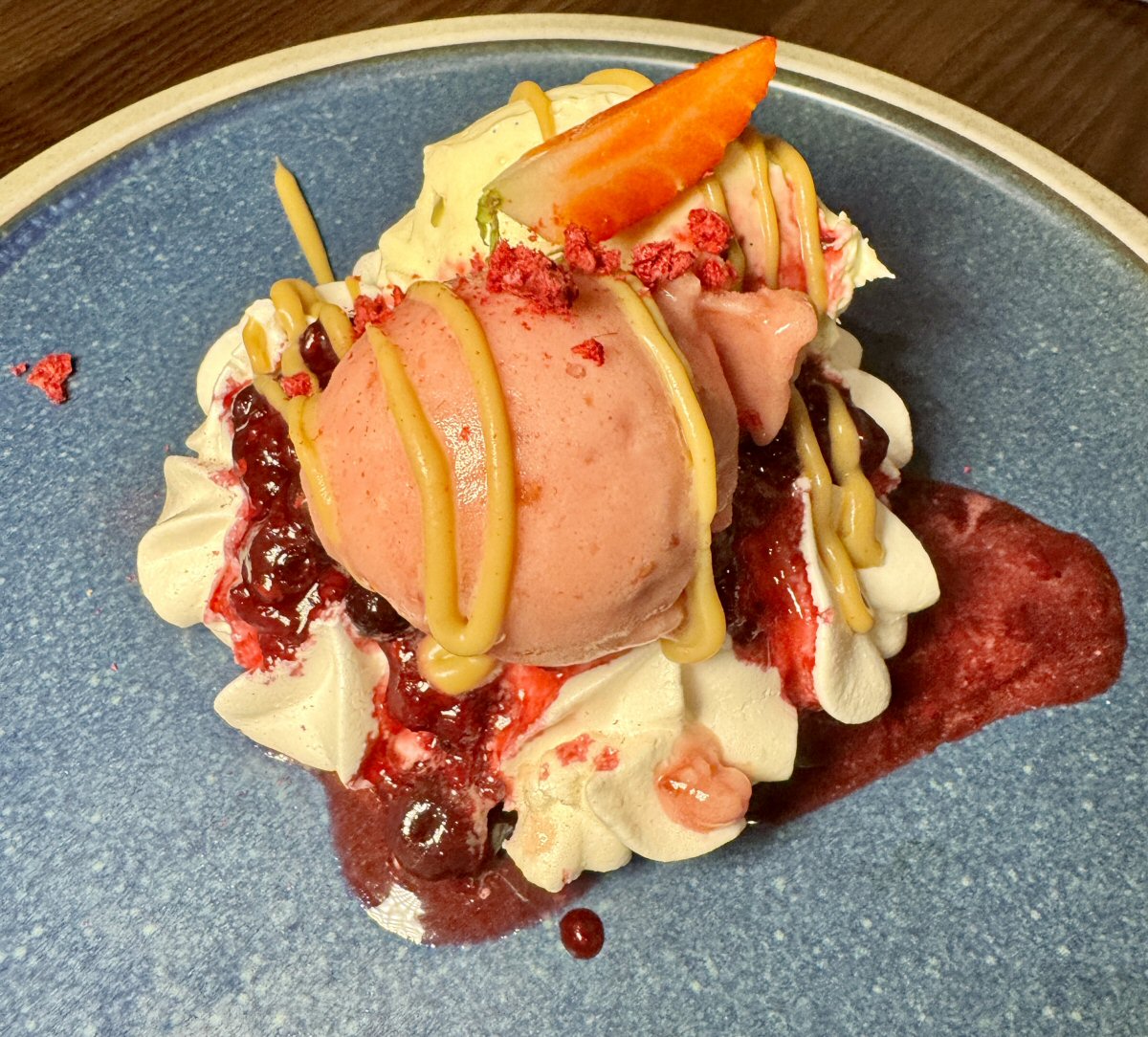 When our server returned after clearing our mains away, having given us time to study the pudding selection, Mummy immediately stated that she was having the Christmas Pudding and Brandy Crème Anglaise, before anyone else could call ‘dibs’ on it! I had really wanted the Steamed Ginger Pudding…until I saw the Banoffee Sauce: gip central. I cannot stomach Banana in any guise, and the feeling is mutual! Instead, I chose the Winter Pavlova with winter Berry Compote, Vanilla Chantilly Cream, Orange Sorbet and a decadent Caramel Sauce. Returning to an old favourite, His Nibs had the Dark Chocolate and Passionfruit Mousse, with Strawberry Compote and Vegan Honeycomb Crumb.