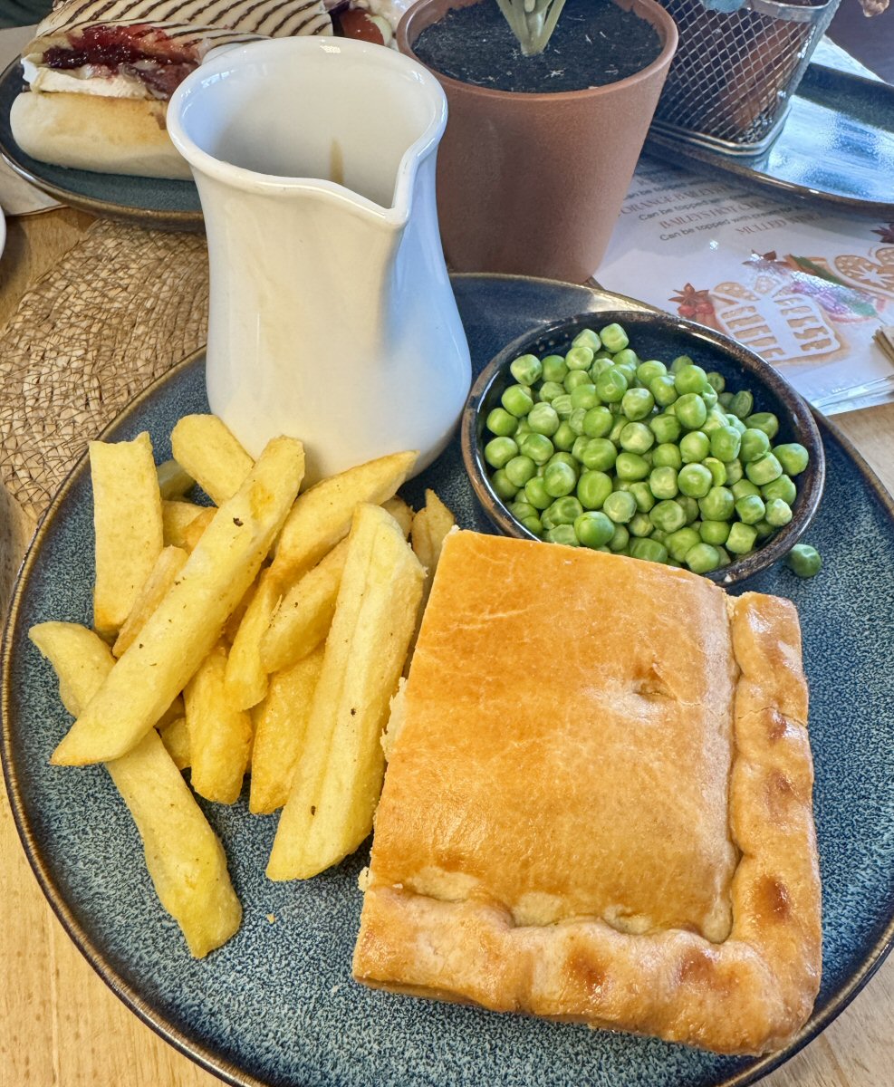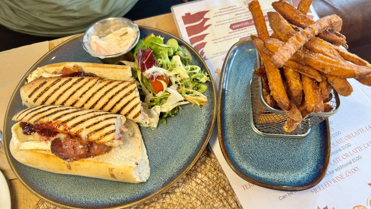 It was soon time for The Man to go to the counter and place our food order: Pie of the Day for him (Chicken, Ham and Leek, £12.95), and a Bacon, Brie and Cranberry Panini for me (£8.95). The Pie came with chips included, so I added a portion of Sweet Potato Fries (£4) to go with my meal. The serving team were all lovely, and the particular lady who brought our meals out, did so with a broad smile on her face.