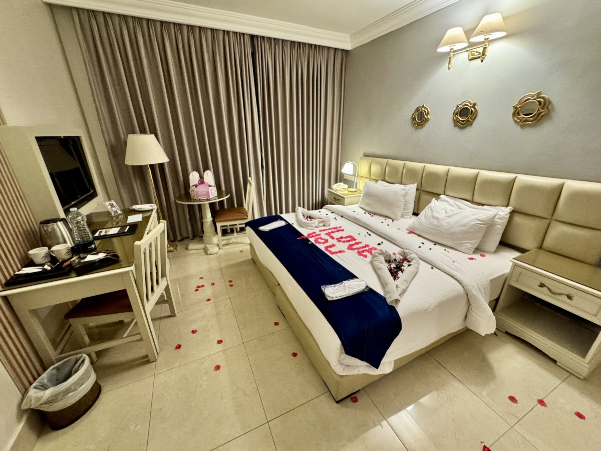 Our late-night arrival meant that we’d missed dinner, but the team had thoughtfully provided us with a substantial buffet selection of food and water. On top of that, because it was our silver anniversary ‘tour’, the housekeeping team had decorated our [huge] room with rose petals on the floor and on the bed, writing ‘I love You’ in petals on the pristine white bed-covers and arranging towels into love-heart shapes.