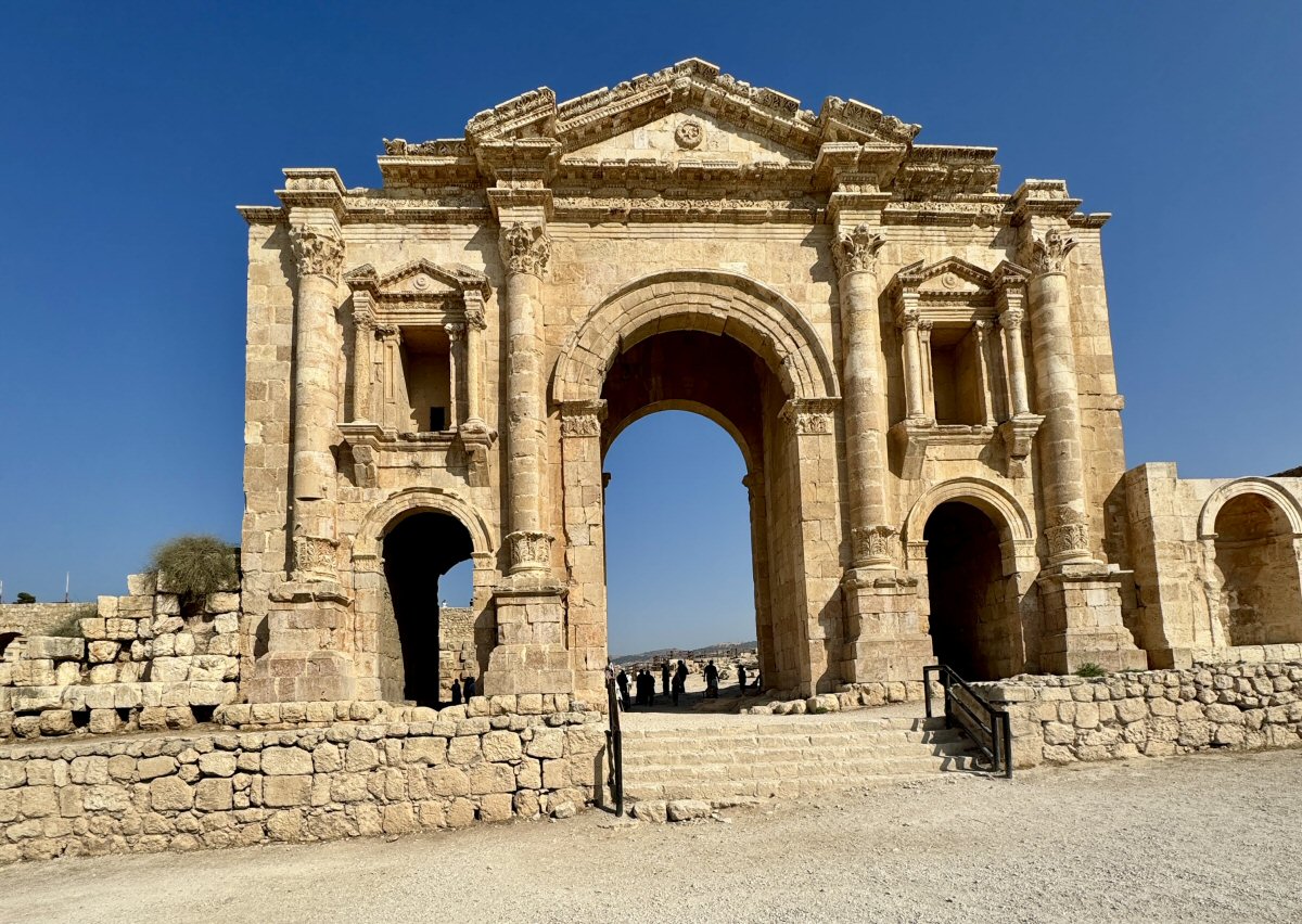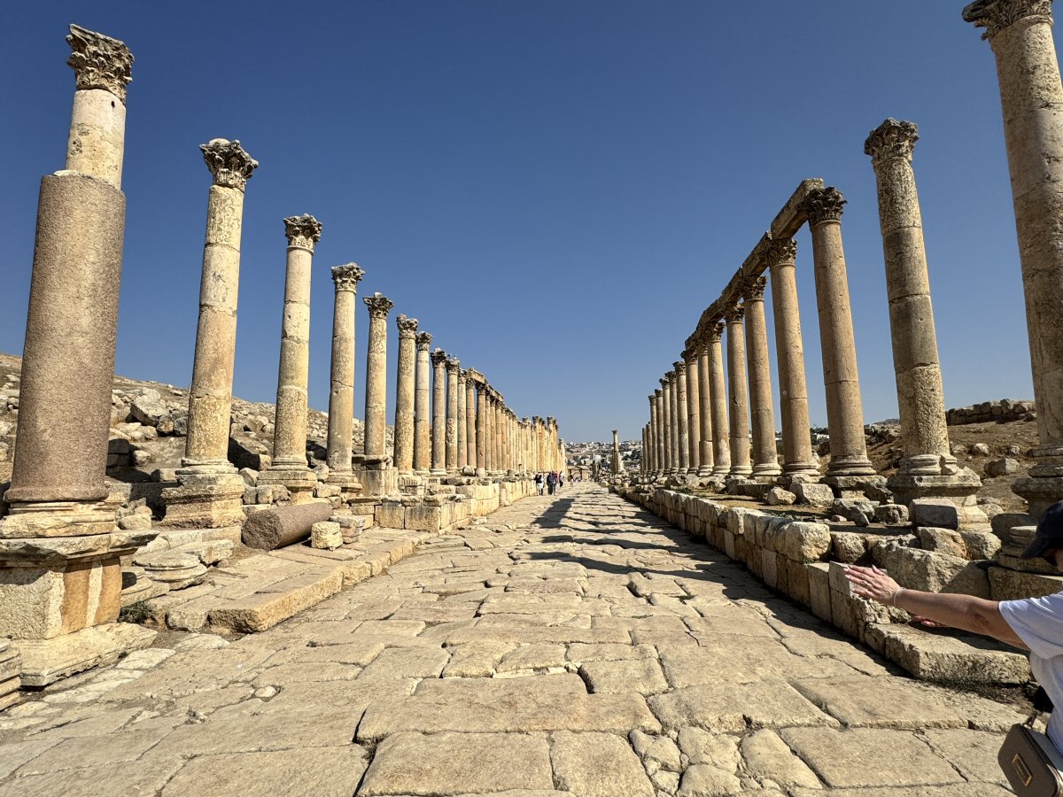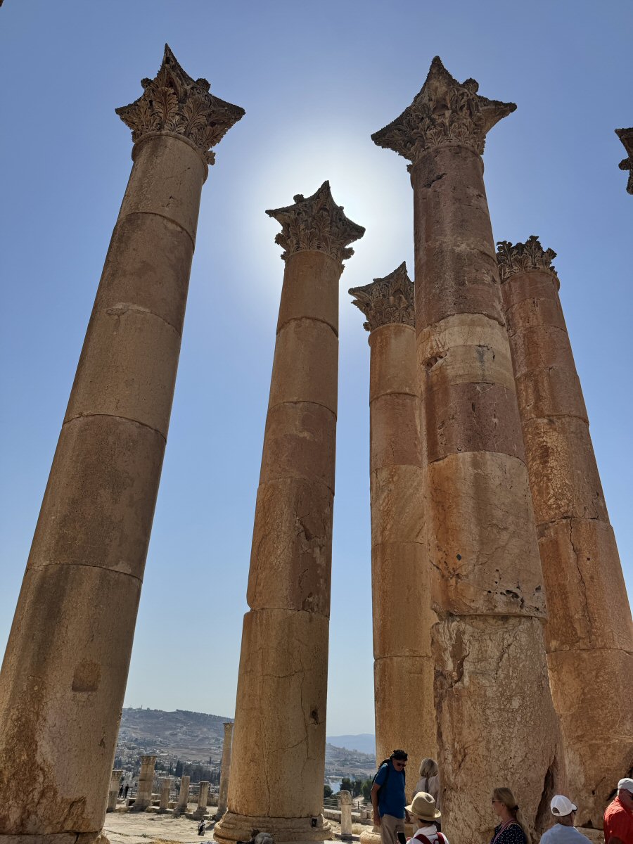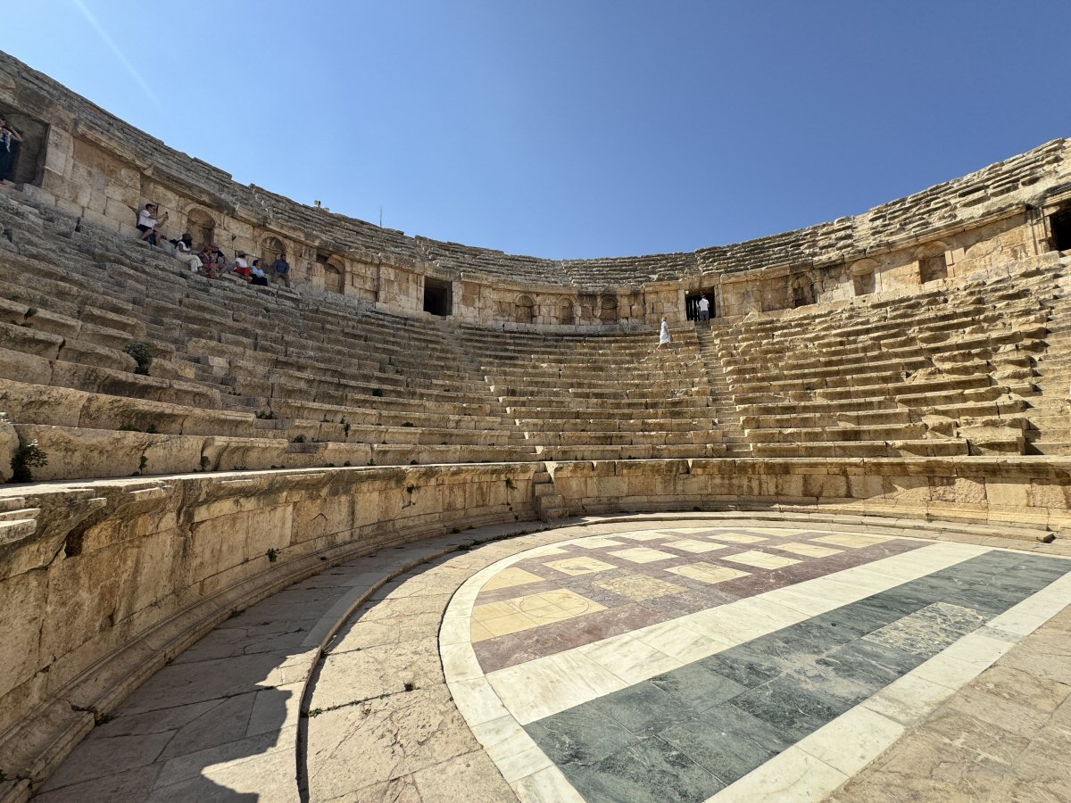 We had a guide around Jerash (aka the city of a thousand columns), taking in the wonderful colonnaded street ruins and the beautiful amphitheatre and its have-to-experience-it-to believe-it acoustics. Our guide showed us where to stand (and it was literally inch precise!) to hear our voices project around the air as if coming through headphones with that stereo sound; no microphone needed here – even at normal volume, our voices were heard loud-and-clear by all those within the space!