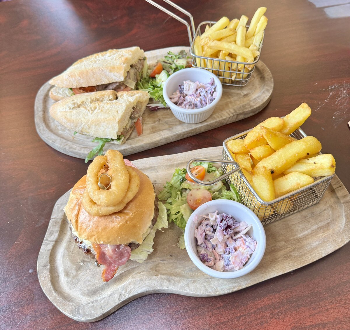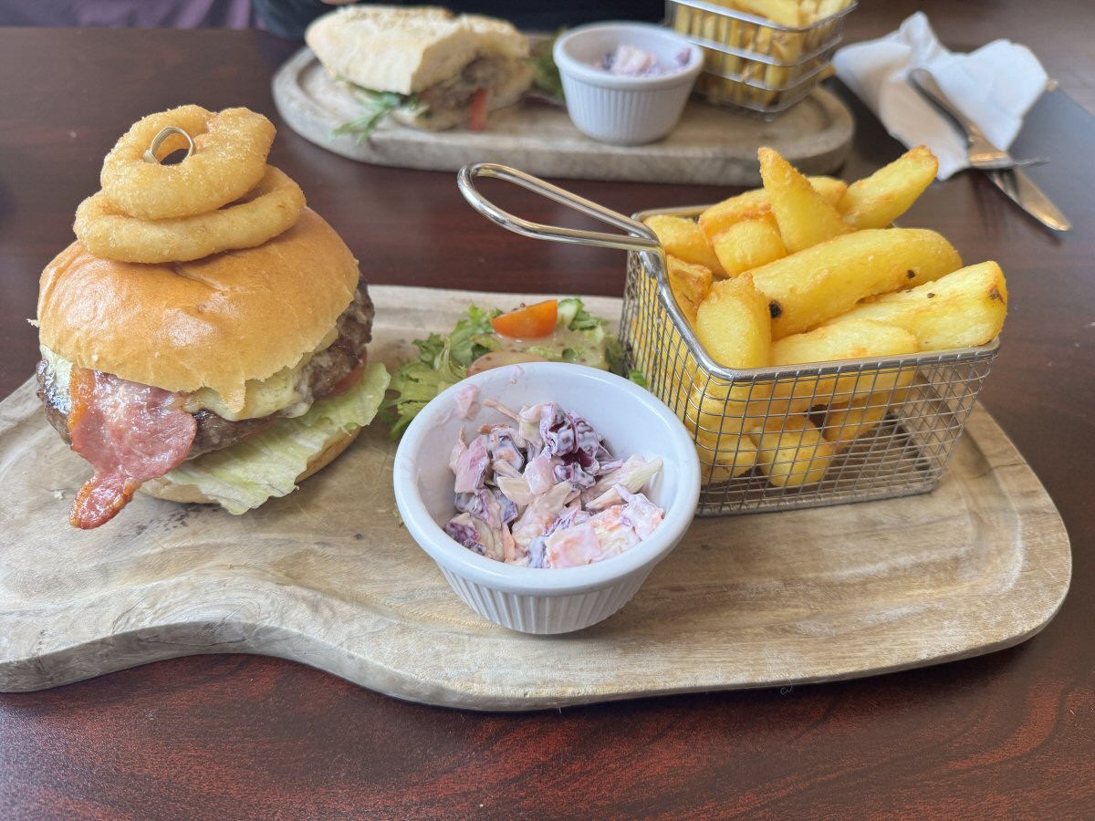 There is a decent selection of hot and cold dishes to choose from, and I opted for the scrummy-sounding Steak, Stilton, Caramelised Onion, Tomato and Rocket Baguette that comes with a dressed Salad, Coleslaw and Skinny Fries (£13.50); His Nibs fancied the sound of The Family Tree Burger that comes with Cheese and Bacon, Iceberg Lettuce, Tomato and Burger Relish and is paired with Gourmet Chips, Onion Rings, dressed Salad and Coleslaw (£14.50).