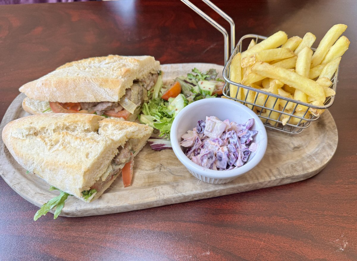 As it happened, the wait really wasn’t that much longer that you’d expect as standard, and we were soon tucking in enthusiasticall. My baguette was lovely and fresh, the bread nicely springy to the bite, and I was filled with happiness to see such a generous amount of Steak pieces tucked inside. The meat was tender and flavoursome, pairing perfectly with the robust tang of melted Stilton cheese. Adding a sublime note of sweetness were the softened, Caramelised Onions; these seemed to intensify both the Steak and the Stilton’s characters, of which I heartily approved! Juicy slices of Tomato were a nice, cool contrast to the warm elements of the baguette, and the Rocket was bright and peppery on the palate. This was a beautiful lunchtime choice in itself, but the dressed Salad was crisp and fresh, the Coleslaw crunchy, and the Skinny Chips hot and nutty-tasting, making this a magnificent meal. Bravo, me, for my choice.