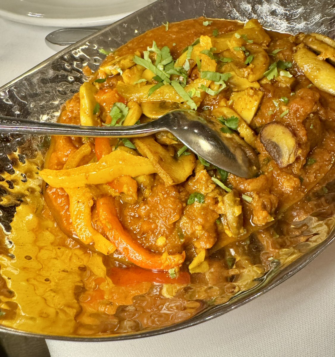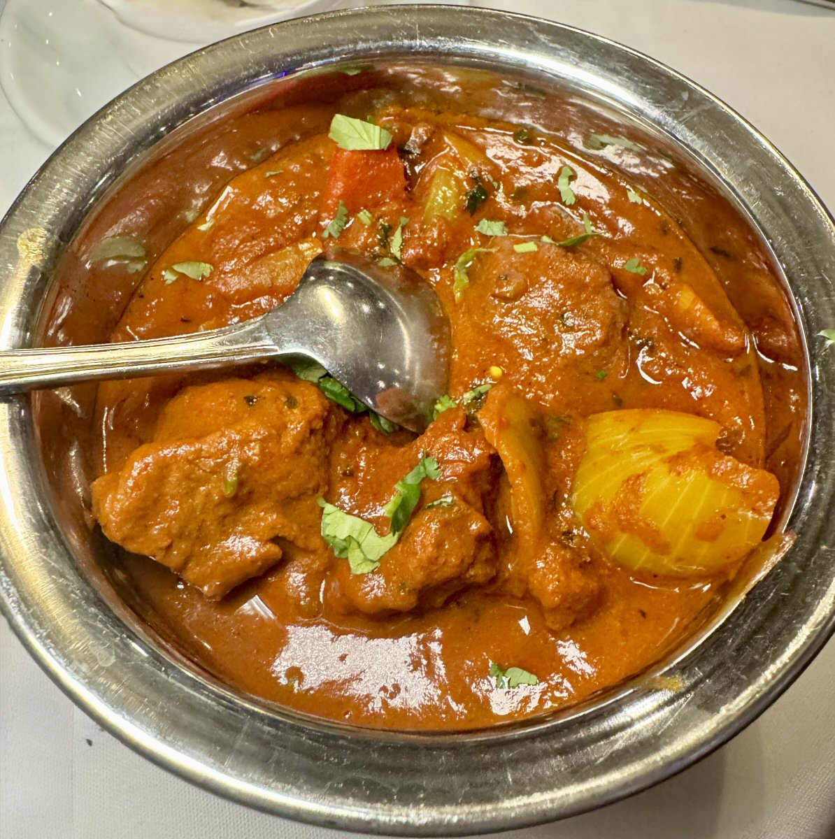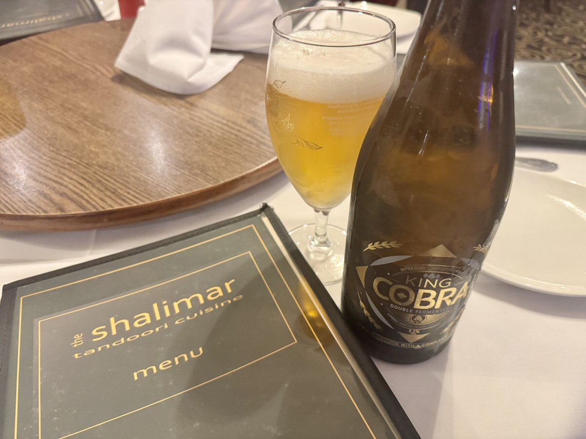 It wasn’t long before the chaps were supping their King Cobra lagers (their yearly treat!) and our server was placing the huge cast iron skillet on the twirling food carousel for us, and we all sighed happily as the sizzling aromas wafted over the table. Ginger isn’t the most adventurous member of our party but, having been brave and tried the Chicken Tikka pieces, decided that they were right up her street and swiped the lot! Can’t blame her, I would’ve done the same if I’d discovered something new that I loved.