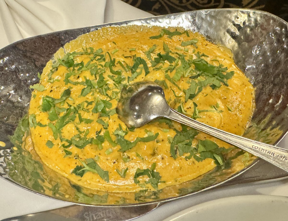 We, meaning His Maj, TBW, BB and myself, are creatures of [broad] habit in that, if we find a dish we really like, we’ll remember it and reorder it; exactly what happened with our curry choices at Shalimar. I revisited that taste sensation of the Kanghan curry that melds juicy King Prawns with Mushrooms, fresh Mint, and a touch of Cream, requesting that it was made spicier and with more fresh Coriander on it than usual (£19.95). If you’ve never had this type of dish before and its Kanghani-spice charms, I can highly recommend it to you. His Nibs chose the Lamb Sharabi (£14.95), a mouth-watering combo of tender Lamb chunks that are cooked in Red Wine, with Spices and Herbs, Tomatoes and Onions to produce a rich, sumptuous dish.