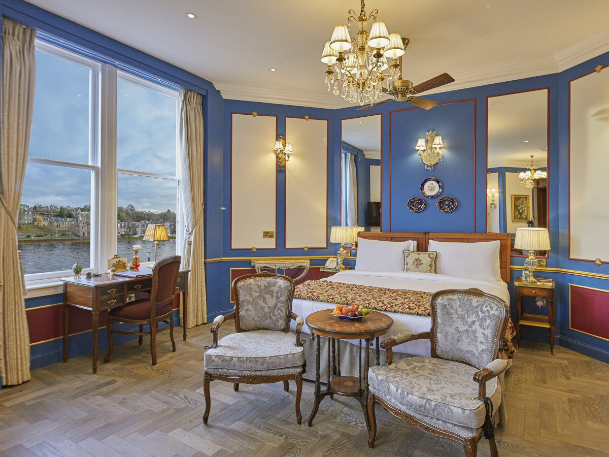 The hotel’s fourteen themed rooms and signature suites are inspired by 19th-century travel and the Scottish landscape.