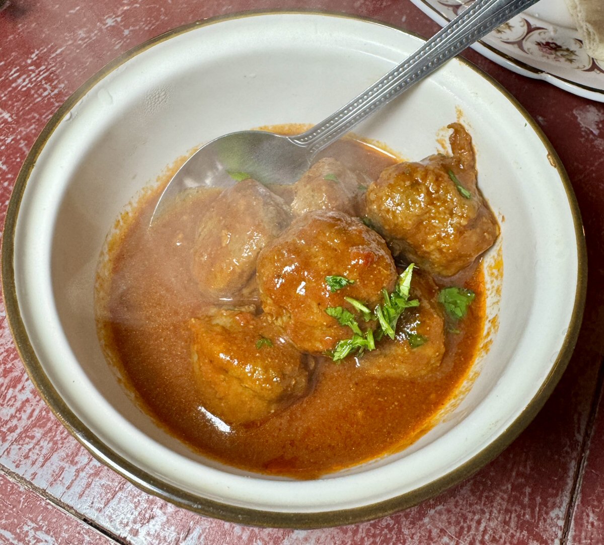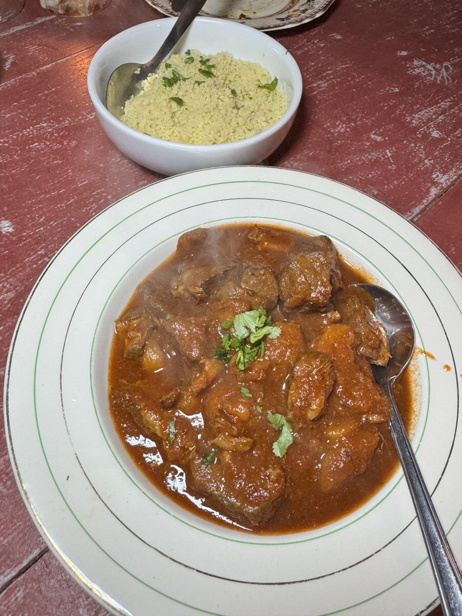 His Nibs fancied something for pudding, so he had Sticky Toffee Pudding with Vanilla Ice cream; we couldn’t all sit idly by and watch him tuck in, so magnificent Lemon Cheesecake and Vanilla Ice cream with Rosewater-soaked Orange slices on the side. Now, Sticky Toffee Pudding might not be Moroccan, but it actually rounded off the meal very nicely, and the Cheesecake was a superb palate cleanser.