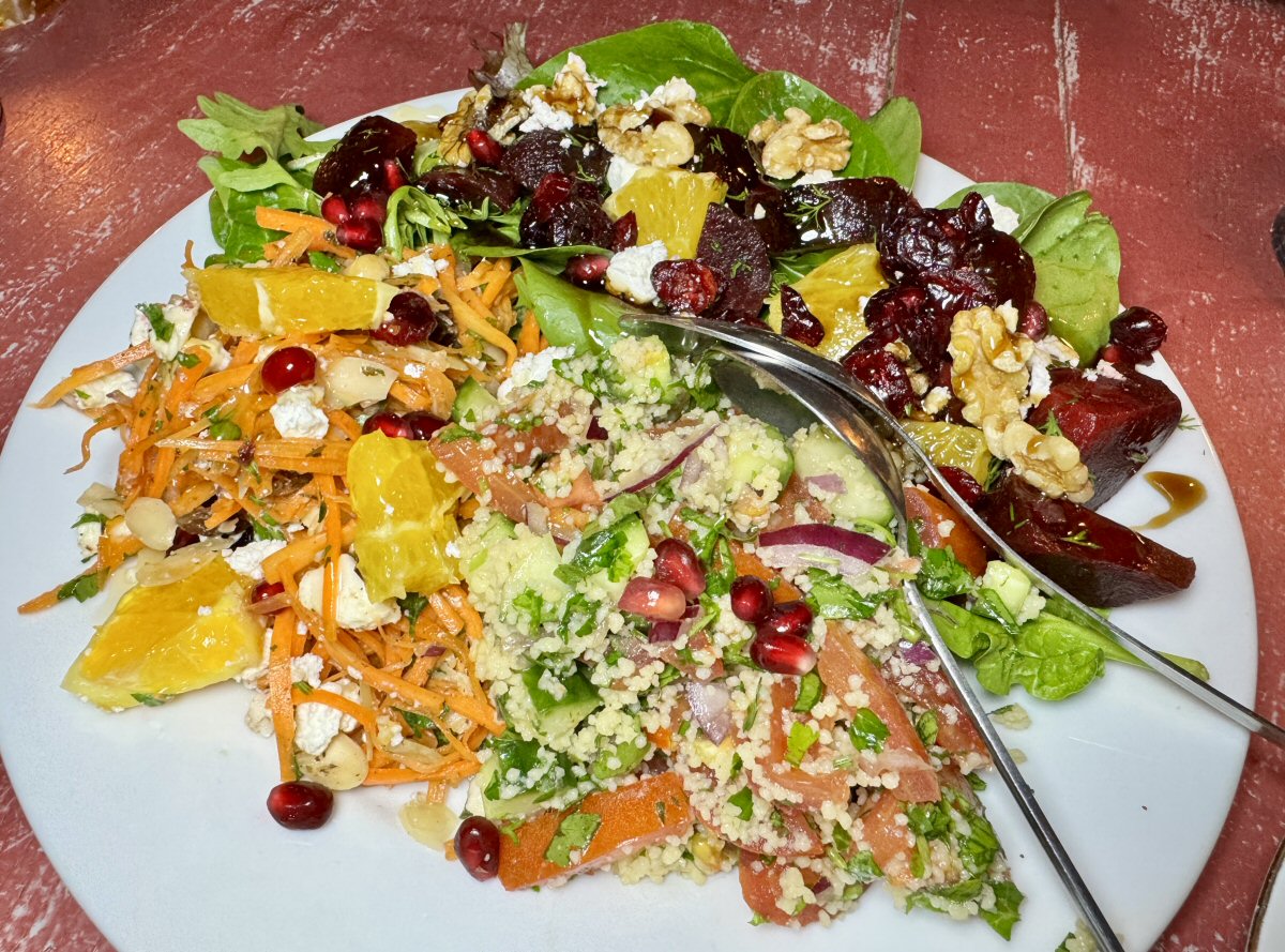 Underneath layers of super-thin, buttery Filo pastry sheets was a sumptuously soft centre of shredded Spinach and pillowy Feta Cheese and its salty, sharp tang. The partnerships of crunchy and soft was absolutely spot-on, and the flavour combination was the business, too. Every time we’ve visited Olive, the salads have been marvellous; even His Nibs is one of the first people to pipe up “Are we having some of Jacqui’s salads?”! On this particular evening, we had a trio of terrificness: Herb-laden Tabbouleh, refreshing Carrot, Sultana and Orange, and our perennial favourite, Orange, Walnut, Beetroot and Feta. As Mezze, you can order this Trio for a set price, or you can order a single variety if you prefer; we went all-in and had the lot, and it wasn’t long before all evidence of their existence had vanished.