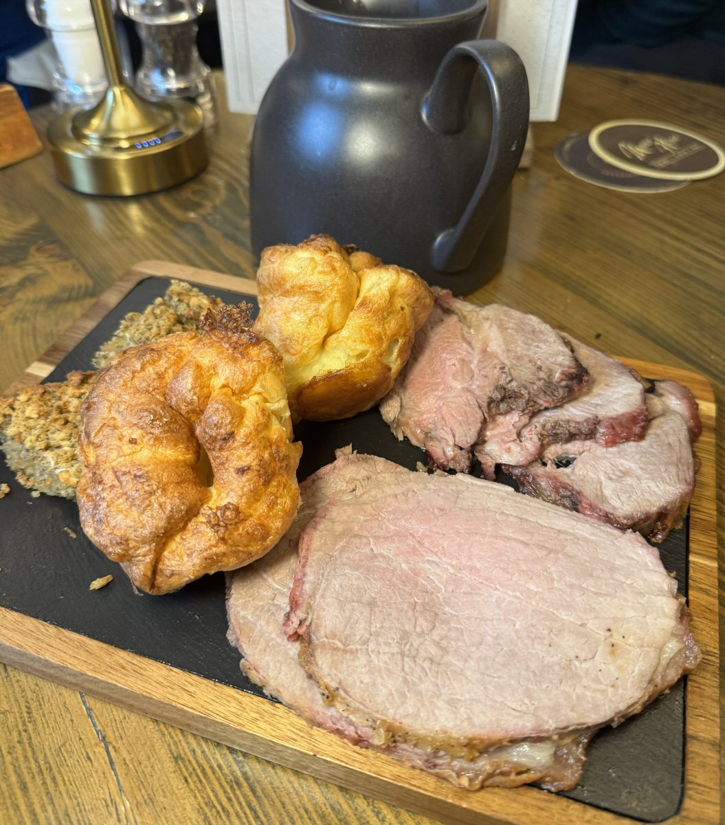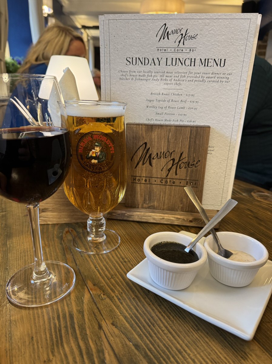 Anyhow, having been comfortably seated, our lovely server got us sorted with drinks: glass of Shiraz for me, pint of Moretti for His Nibs, and a short while later she returned to take our food order. Many venues have stopped serving Lamb for their Sunday roasts at the moment (due to its cost), but I do like a nice bit of ‘Larry’ it made my day when I spotted it on The Manor Hotel’s menu, so that was what I ordered (£20.95).The Man Bird fancied himself a bit of Angus Topside (£19.95) which I was expecting, as the third choice was Roast Chicken (£17.95). Those amongst you who have a more restrained appetite, you’ll be pleased to hear that this team do small portions of the roasts, priced at £12.95. All the roasts at The Manor House Hotel are served with house-made Yorkshire Pudding, Roasties, Cauliflower Cheese, Stuffing, and Seasonal Vegetables. Huge jugs of house-made Gravy come with your meal, too, and we were asked if we’d like any sauces to accompany our meats: I asked for Mint, His Nibs requested Horseradish.