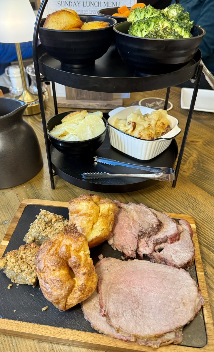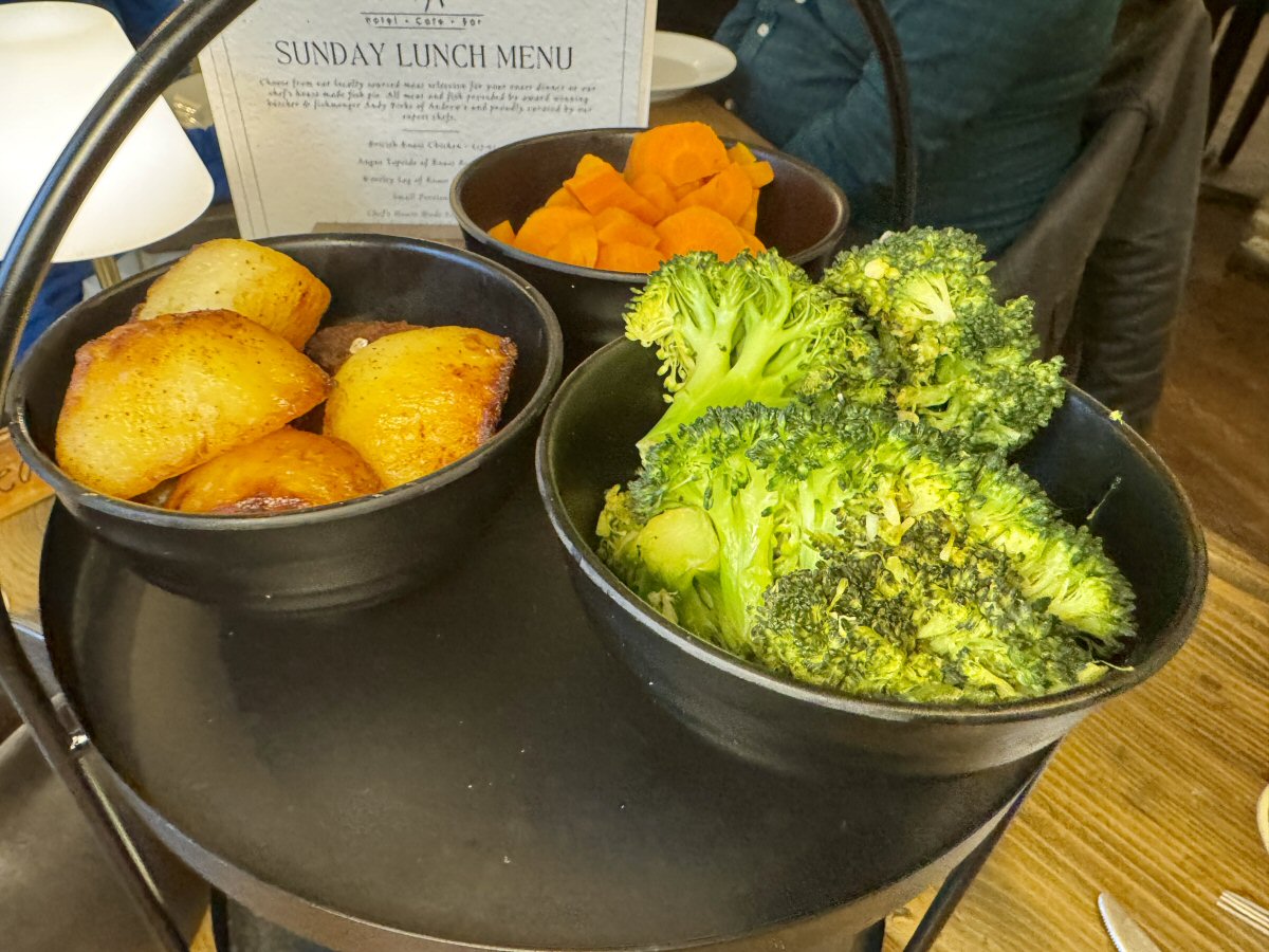 The Manor House Hotel in Dronfield presents its Sunday Roasts exquisitely, in my opinion; the meats, stuffing slices and Yorkshire puds came on a wooden board, whilst the vegetables and other elements all came on a black, two-tiered [afternoon tea] stand. We both remarked on the deliciousness of our meats, and were appreciative that each had that tantalising rose-pink hint at their centre. Portion-wise, you couldn’t grumble at the meats either: I got a trio of slices, and The Man had a duo, and Chef had ensured that they were tender, juicy morsels.