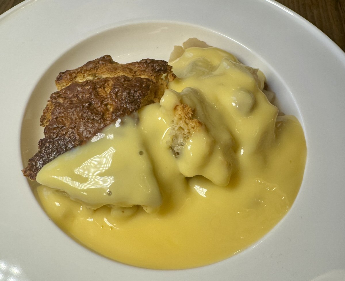 There’s something evocative about a Cobbler that’s done well; the mid-texture scone/cake has that marvellous crispy crunch to its bite, whilst the underside has absorbed the cooked fruit and becomes softer and more comforting. I have to say, the offering here was totally spot-on and I grinned happily with every crumb of it that passed my lips. The apple hadn’t been overly sweetened, a relief seeing as there was sugar already in the cobbler itself, and the result was a beautifully balanced pud.