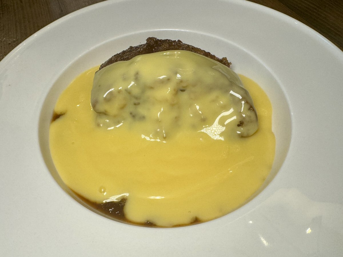 Just as wonderful was His Nibs’ choice: its deep colour belied the texture, which was surprisingly light. Some Sticky Toffee puds have a’ grittiness’ in the mouth, but this one was like marble in its smoothness! You got a clear whoosh of Toffee in the sponge and it had a thick, sticky layer of toffee on its surface that was complemented by a slicker version that was swirled around the bowl; yinning to the yang of the custard. The serving team hadn’t been shy when it came to the custard or the toffee sauce, a fact that didn’t go un-noticed or unappreciated by His Nibs.