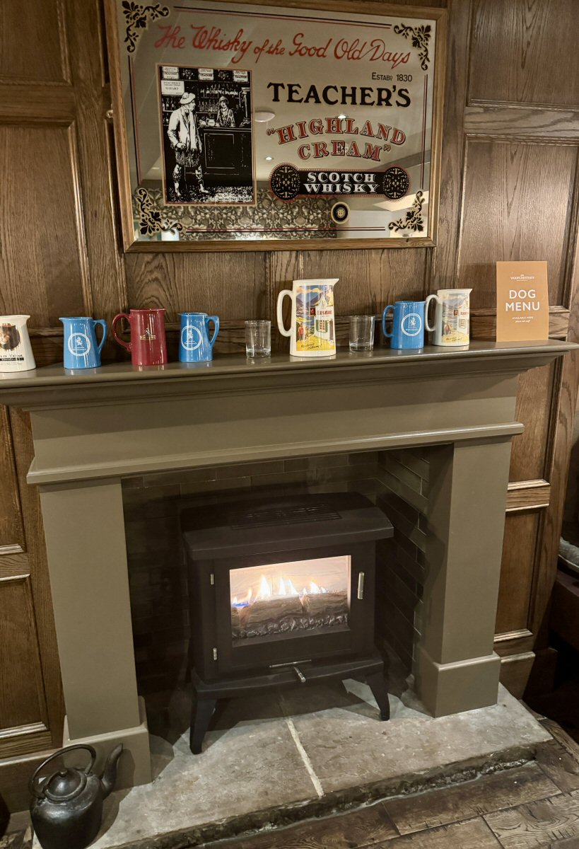On the bottom [panelled] half of the walls, a warm-undertone based shade of deep green/grey/brown added a cocooning feel that was enriched by the tonally painted ceiling; a stark white would’ve just ruined the effect. Landscapes and historical pictures hung on the walls, as well as retro food and beverage advertising prints. As I said, your beloved, traditional pub; one that allows furries- and young non-furries (kids) throughout the entire venue. Children have their own menu (though they can have the ‘normal’ choices, too) and dogs have one of the widest selections we’ve come across: as well as water, they can have their pick from ‘Sir Woofchesters’ menu; snack bars, treat pots and bowls, all in a variety of options. We spotted our pooch’s faves from The Canine Menu: Rabbit, Boar, or Buffalo chews at £2.50 each.