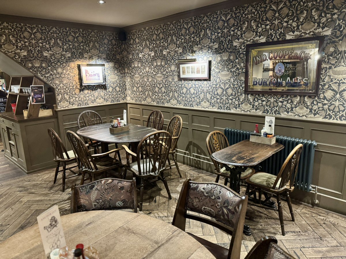 The ambience of The Anchor Inn at Tideswell is just what you’d want from a traditional country pub; cosy, inviting and seemingly familiar. Throughout, the lighting was at a homely level; any extra illumination above the tables either coming from spotlights or pendants hanging above them. I do like a wooden floor, and the herringbone-laid one here was nicely matte, rather than being polished to within an inch of its life. This natural patina was picked up nicely in the rich shade of the solid chairs and benches that provided seating in the restaurant. At the rear of the chairs was a faded floral-patterned upholstery, echoed by the William Morris wallpaper in tones of brown and cream on a deepest charcoal background that adorned the upper level of the walls.