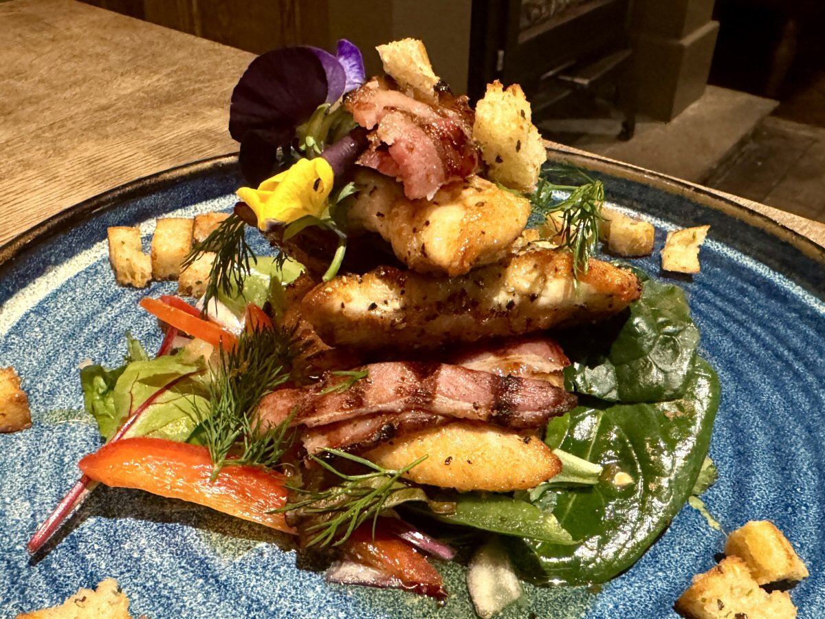 Cutlery and thick napkins were already on the table so, when the food arrived and the obligatory photos were taken, we jumped straight in. From the get-go, it was clear that ‘Team Anchor’ are feeders! The Chicken breast was a good size, and was partnered by equally plentiful, cut-into-thirds rashers of [what I would call] proper farmhouse Bacon; where the poultry was mild and creamy, the bacon was meaty and gently salty. When The Man popped a Garlicky Crouton into his mouth, I swear you could hear the crunch in the next county – it was the equivalent of a sonic boom, in food form! The sweet, sticky Honey and Dill dressing was also a winner in His Nibs’ opinion, and he mixed it in with all the elements on his plate. Visually, this dish was amazing; served on a dramatic, mottled Azure blue platter, the colours of the meal stood out marvellously – talk about impactful!