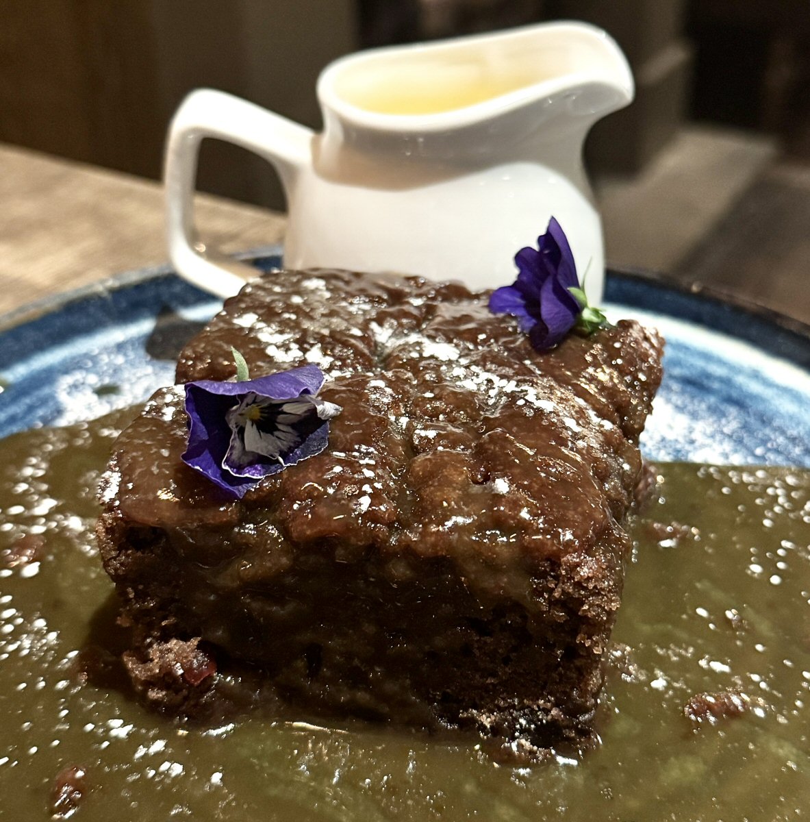 When I say that, if an army came in to eat the Sticky Toffee Pudding at The Anchor Inn, one portion would suffice; trust me, I’m not fibbing! Over the years, The Man has eaten his fair share of puds, but this slab is easily the biggest – and one of the tastiest. Dark in colour, mid-textured, and marvellously rich in taste, this treasure was excellent. Chef had decorated the top with edible flowers for an injection of colour, adding dusted Icing Sugar to enhance the visual. There was plenty of sweet, sticky Toffee sauce surrounding the pudding, too, so all the flavour bases were more than adequately covered.