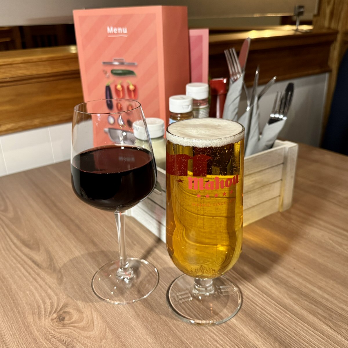 Shamima was our server for the evening and she swiftly took us through our dining options; our dinner, bed and breakfast package offered us a different menu to the ‘open’ one, but still included all 3 courses. All we’d need to pay for was drinks and any upgrades, such as the fries-for-sweet-potato-fries option that I took. I fancied a large glass of Shiraz (£10.20) and The Man had a pint of draught Mahou (£6.85) and Shamima offered us iced water for the table, too.