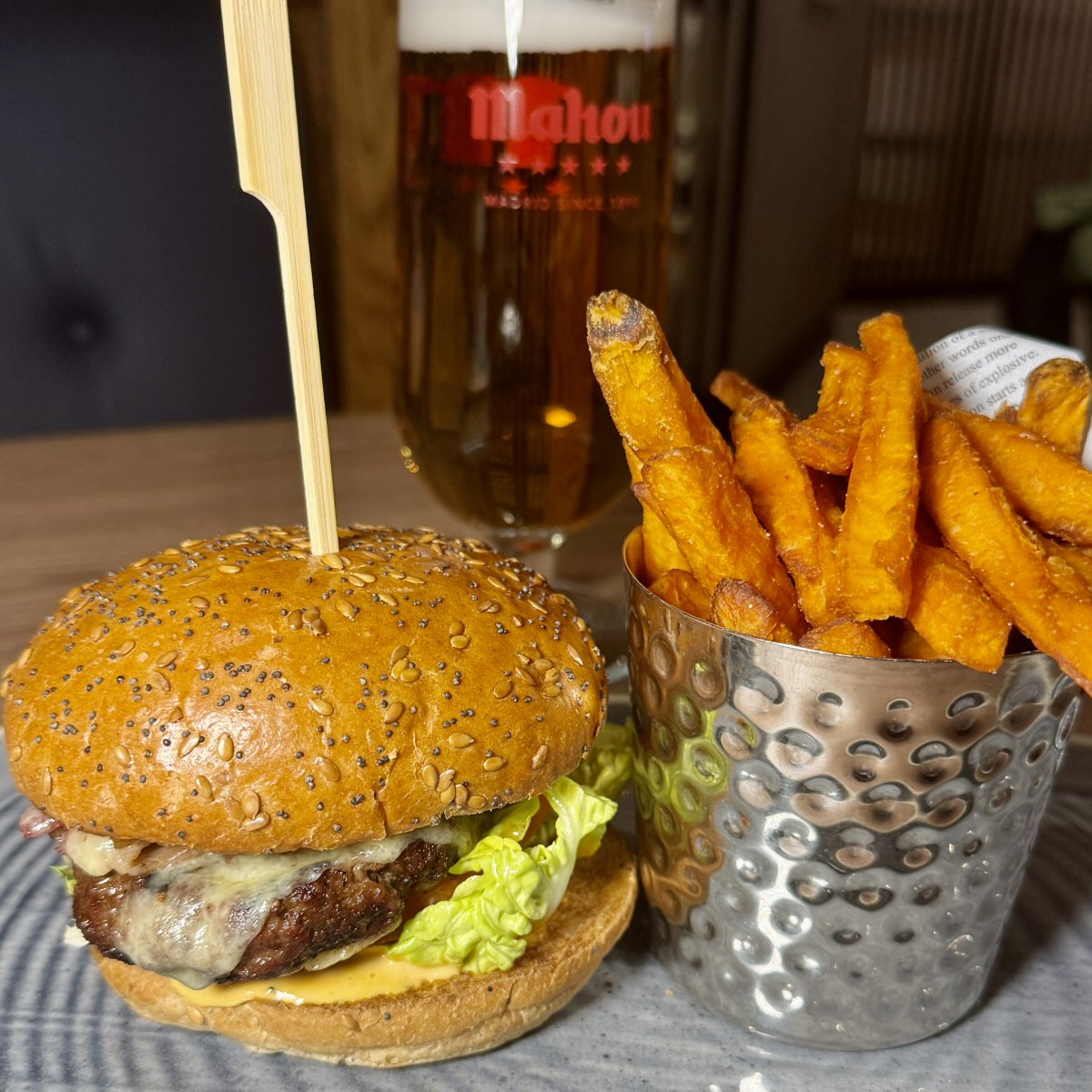 Fans of a burger won’t grumble at this offering; full of flavour, and with a pleasingly dense texture, this Beef was juicy and filling. I was pleased to discover that the Bun that housed everything was toasted, preventing it from becoming soggy and claggy with the House Burger Sauce and Mayonnaise. Lightening the flavour profile were crisp Lettuce, slices of sweet-tasting Fresh Tomato and sharp Red Onion, all ably assisted by melting, tangy Mature Cheddar Cheese. I had chosen to swap my skin-on Fries for their [in my opinion] better cousins, Sweet Potato morsels; it only costs a quid more to do this, so why not? The Sweet Potato Fries were just as plentiful as the ‘ordinary’ ones and came in the same hammered metal ‘bucket’ as His Nibs’ ones had done, separate from the Burger.