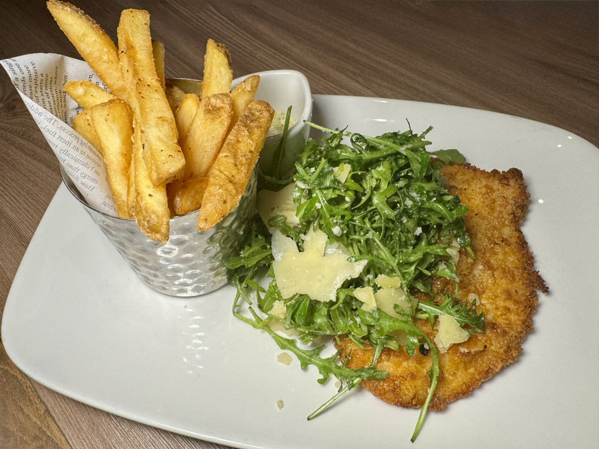 Great start to the meal; could it continue at such a high standard with our main choices of Aberdeen Angus Beef Burger, and Chicken Schnitzel? Short answer: yes. The Man Bird said that his butterflied, crumb-coated Chicken Breast was impossibly moist and juicy, tucked beneath a beautifully crisp, fried-golden blanket. Rather than slather the Garlic and Parsley Butter directly onto the Schnitzel, which might have made it soggy, the team served this melted delight in a separate jug, allowing The Man to add as much as his heart desired…that’ll be all of it, then! The skin-on Fries were nicely crispy and came in their own hammered-metal bucket; they had a gently nutty taste and weren’t at all greasy. On the side of the rectangular platter was a colourful mound of fresh, peppery-tasting Rocket leaves that had been dressed with finely Grated Parmesan and then garnished with larger shavings of the pungent Cheese for more oomph on the palate. This was a truly great meal; one that we’d both happily order if we stay here again in future (which hopefully we will).