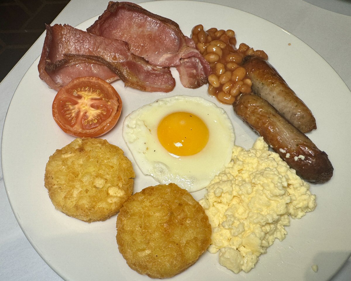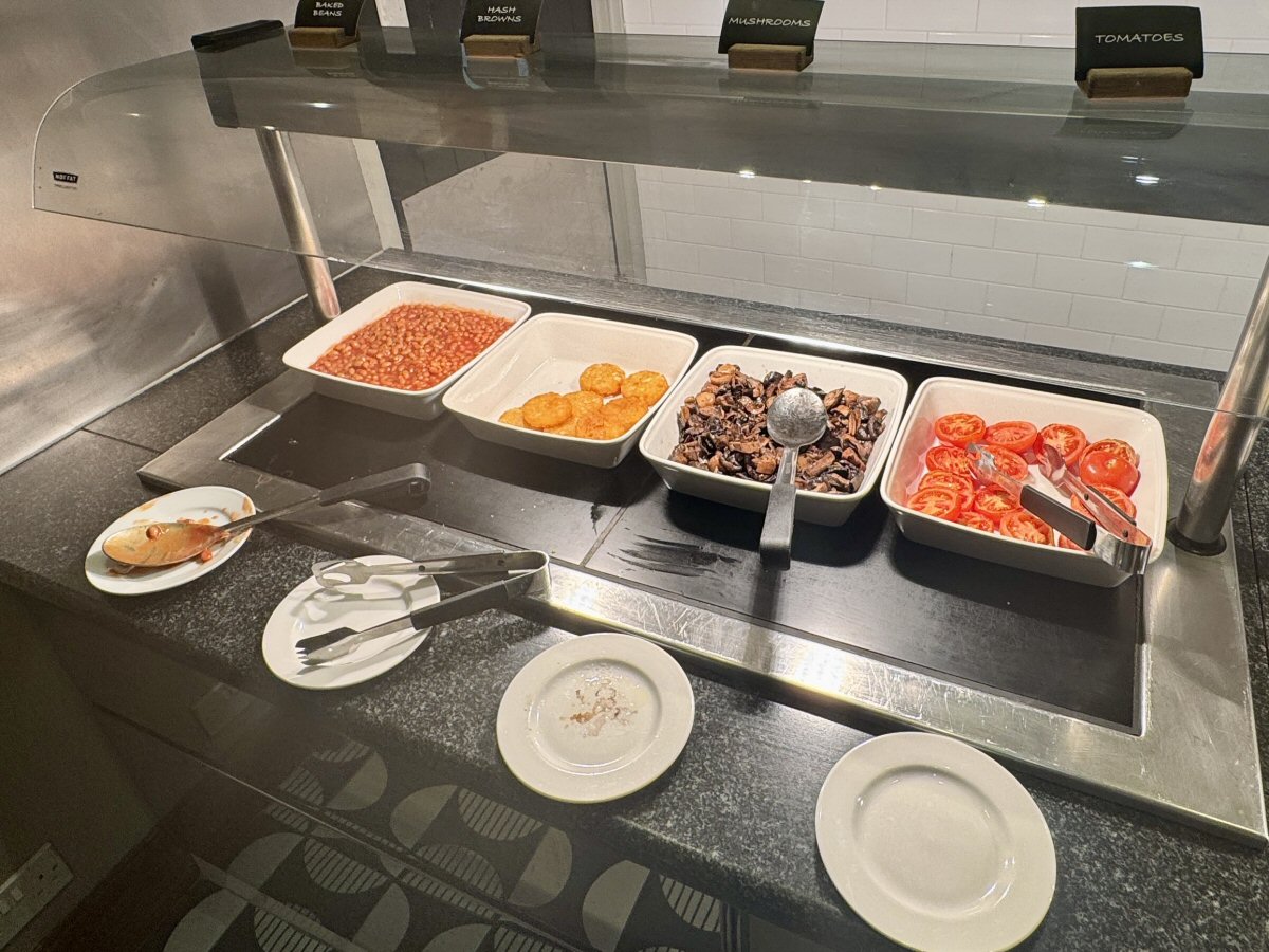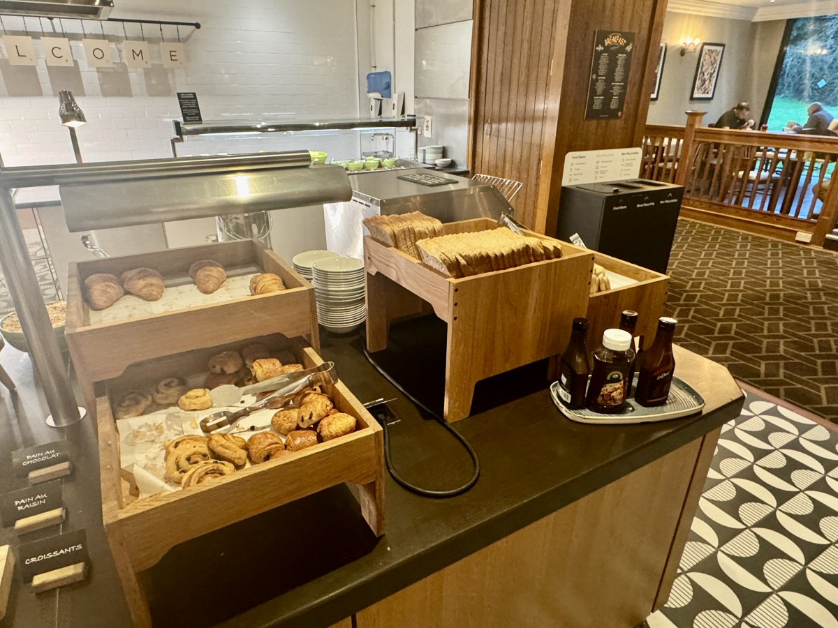 Next to the toaster were breads of all types (including gluten free) and here you could also help yourself to Croissants, Pastries, and Pain au Chocolat/Raisin. Neither The Man or I bothered with breads or pastries, skipping over to the hot counter instead. Fried and Scrambled Eggs are out on the counter, but you can also request Poached or Soft-Boiled from your server from the kitchen; I believe I heard a fellow guest ask for an Omelette, too. I helped myself to some soft, scrambled Egg, two halves of grilled, fresh Tomato, and plenty of Mushrooms and it made for a super-tasty start to my day. His Nibs, bless his cotton socks, had to go off to his day job, so set himself up with a full-on cooked brekkie; fried egg, slices of crispy bacon (he specifically picked the crispy ones out), half a tomato, beans, hash browns, and sausage. Before you think “well, he’s a working lad, he needs his food”, I will just say that he was going to have a pub lunch (Lasagne, as it turns out), so no sympathy needed!