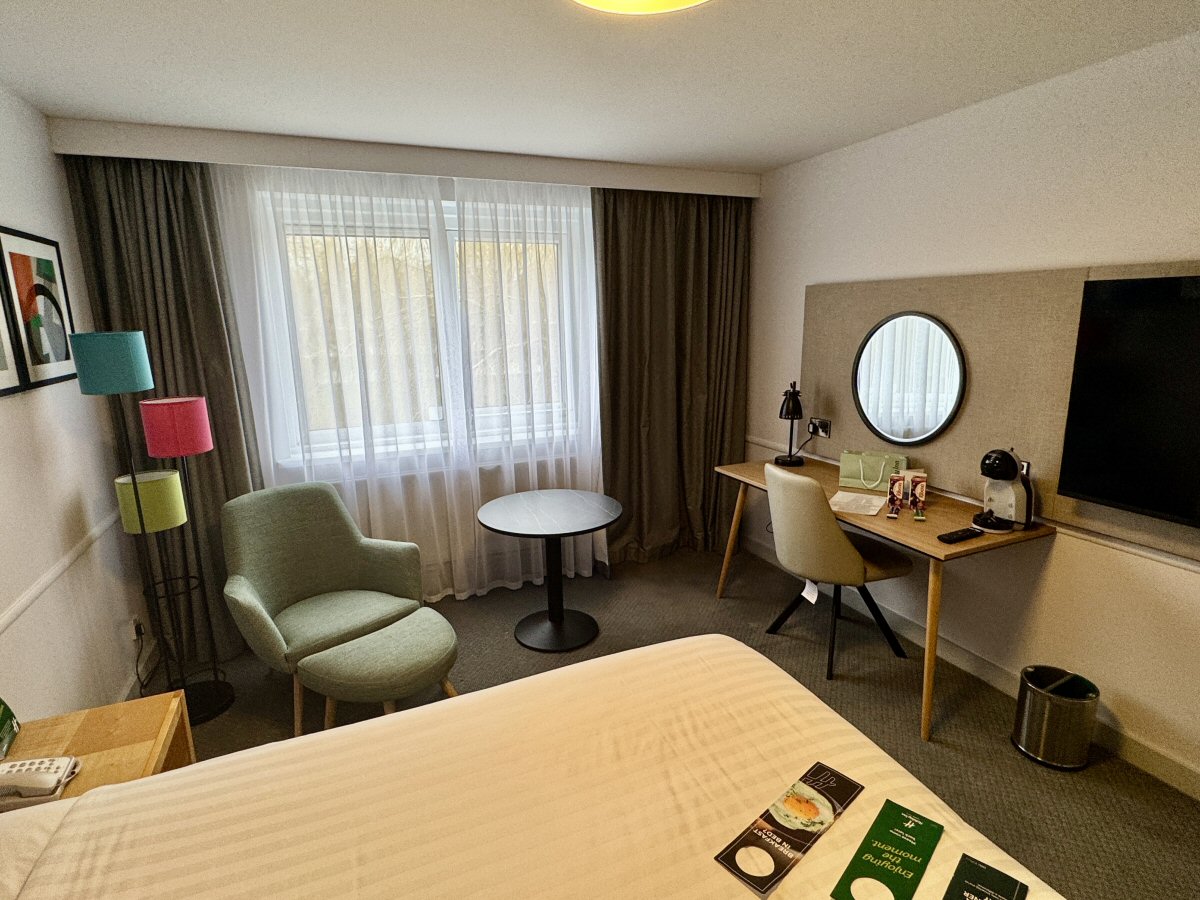 As well as a very comfy lounge chair and footstool combo that I bagged for reading in (thanks to its proximity to a trendy, three-tiered floor lamp), there is a large writing/working desk and seat for business users and a well-stocked hostess trolley with kettle, teas, coffees, sugar, milk, and biccies – essential brain-food. Fans of the bean will be happy to hear that there’s also a pod machine, and both full-fat and decaff pods. Whilst I stuck the kettle on, His Nibs availed himself of [it seemed] every single socket to plug USB and USB-C devices in, and made good use of the high-speed wi-fi to send some urgent emails. After dinner, that wi-fi came in handy to ‘cast’ a series that we’d been watching at home to the large screen TV at the end of the bed! Back in the present moment, we took a peek out of our window and saw the beautiful landscaped lawn, trees and pond that had geese lazing on its banks. These monkeys (yes, I know they’re Geese!) provide a natural alarm-clock in the morning, should you not be ‘on the clock’ so to speak; think of it as a bit of the countryside near to the city…I did, when I wanted to tell them to shut up!