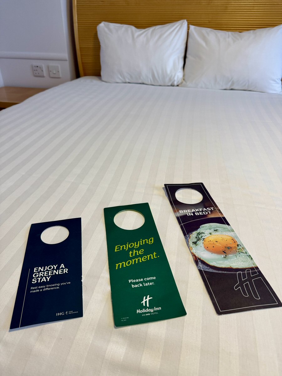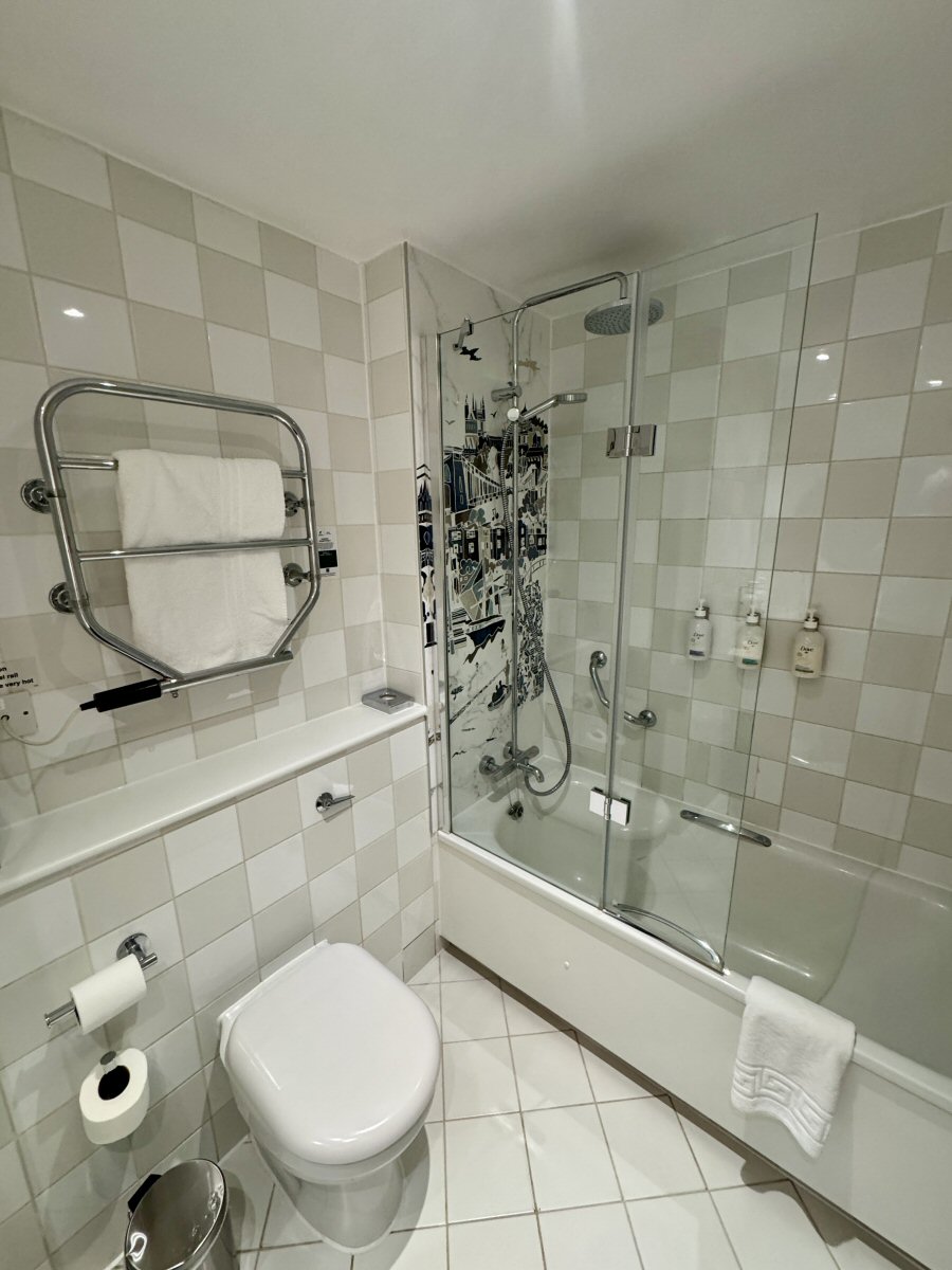 Opening the door to our Premier Double room (1 of the hotel’s 211), we were both impressed by just how much space there was! The bathroom has a swish rainfall shower-over-bath configuration, complete with Dove toiletries: Shampoo, Conditioner, and Body Wash, with Hand Wash and Body Lotion at the side of the wash basin. Plush towels and a bath-mat were also provided.