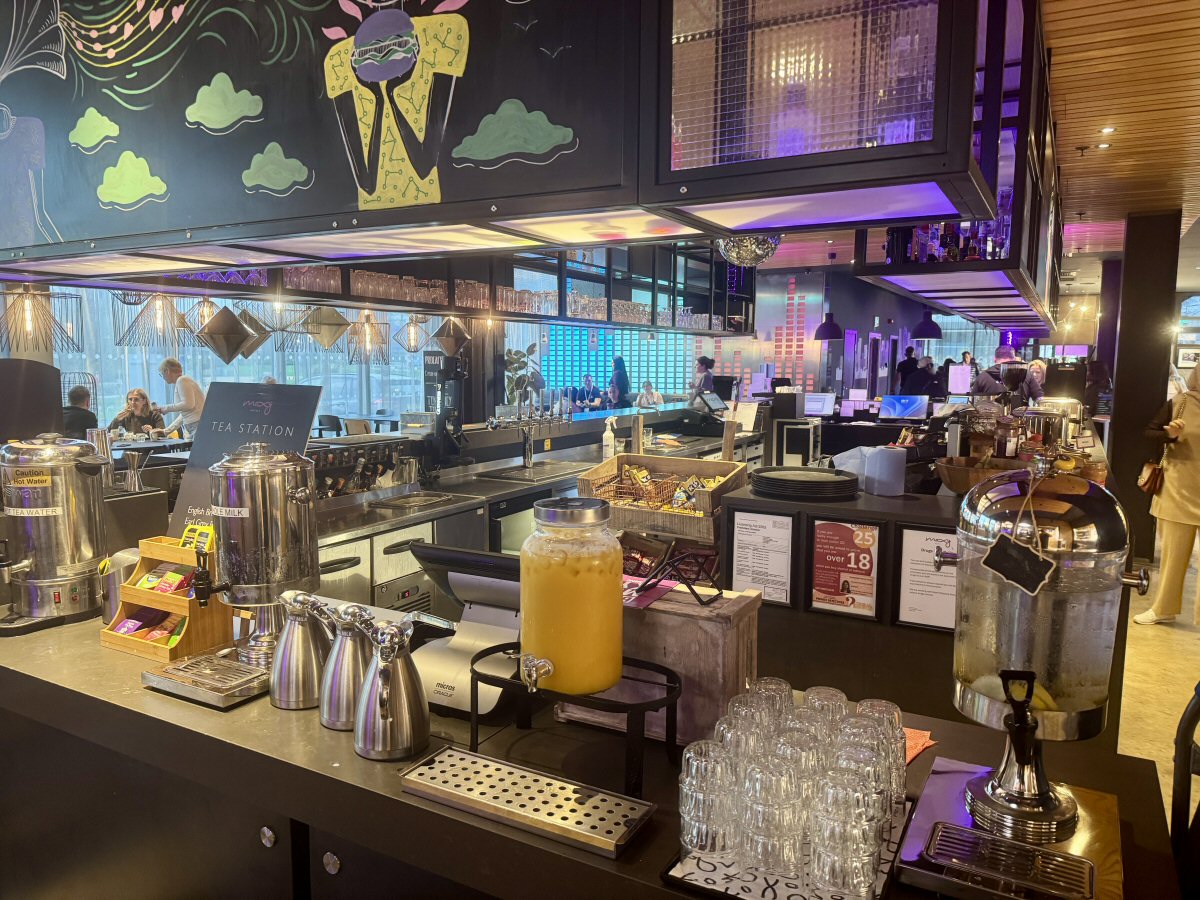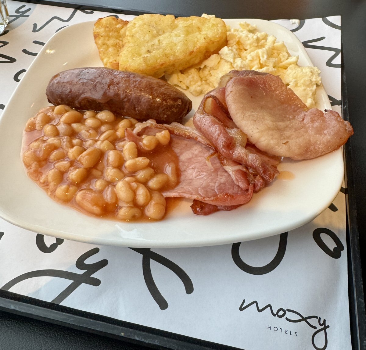 Grabbing cutlery, and a Moxy logo’d tray, we hit up the chilled counter where the fresh fruit mixes, yoghurts, meats, cheeses and salad were housed. Both of us grabbed a bowl of plain Greek yoghurt and topped it with fruits, then went back to eat those. Our second course consisted of Croissant for him and Apricot Danish for me, and some items from the hot counter: Full English for The Man, Scrambled Egg and grilled fresh Tomato halves for me – there was not a single ‘shroom in sight boo, hiss. The Moxy team never stopped replenishing the trays of food, or clearing tables of trays if folks didn’t do it themselves.
