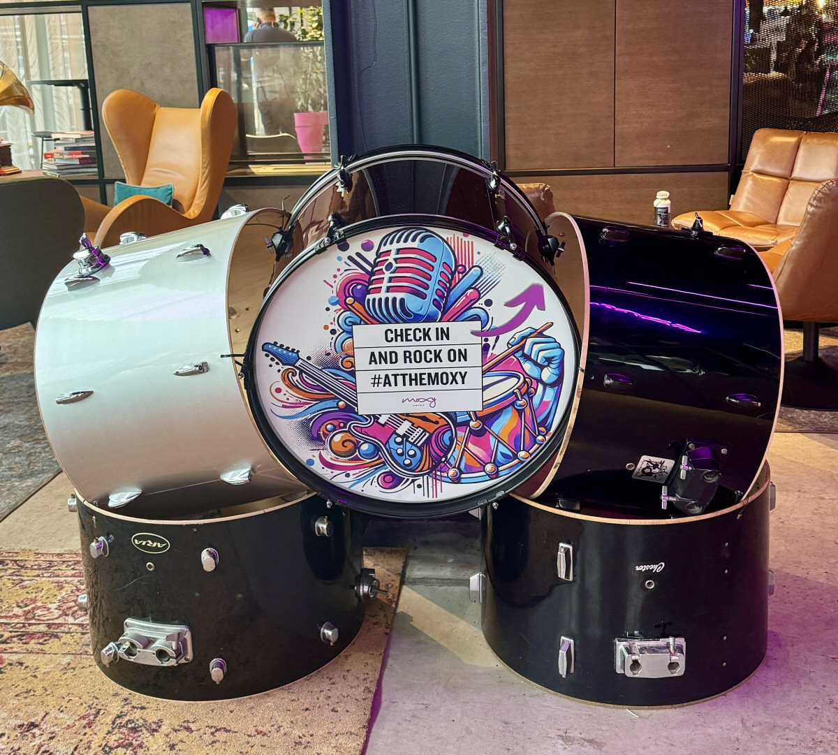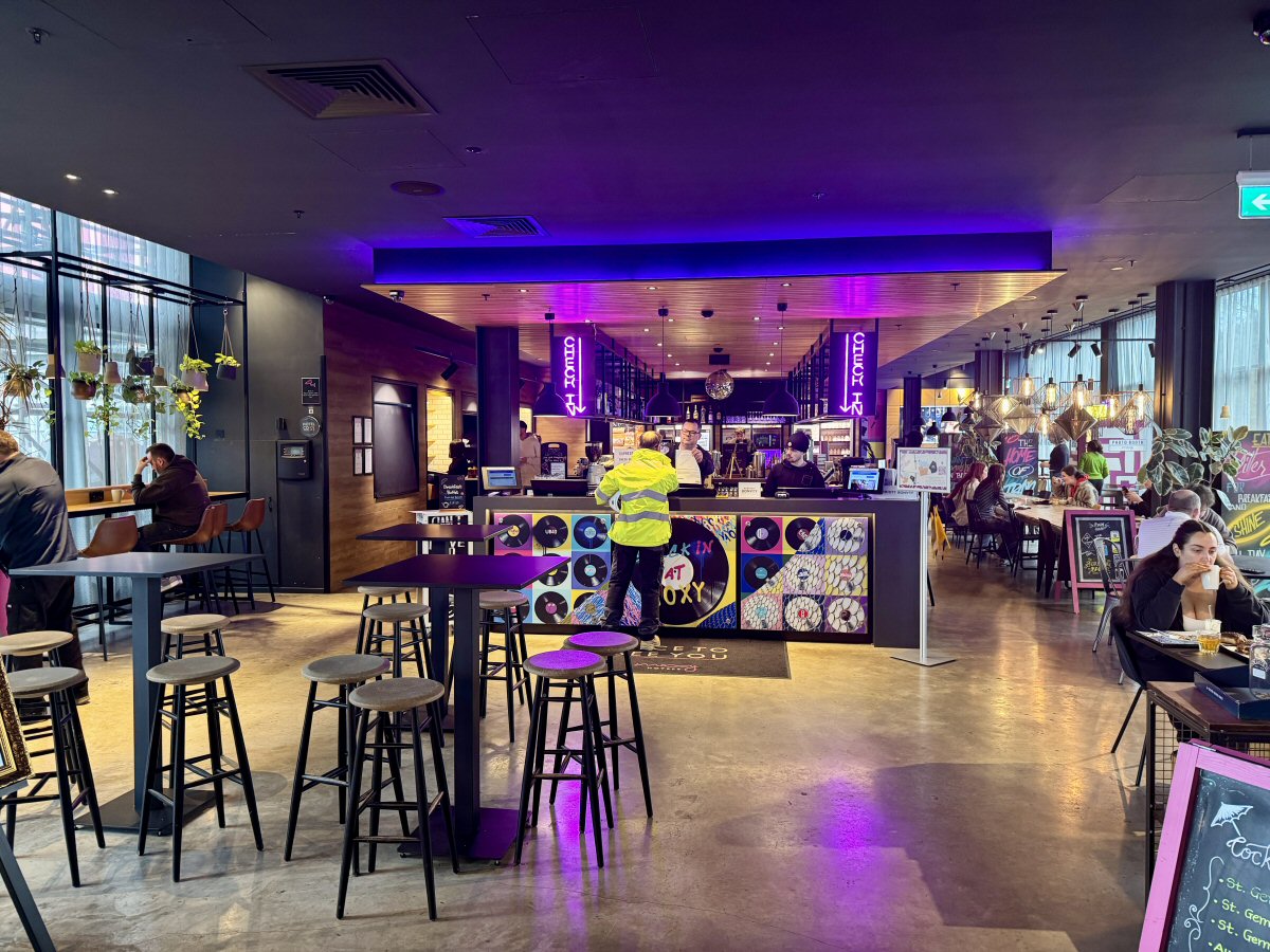 When we’d finished, we went over to the Moxy to check-in, going straight to the neon-signed desk as there was no queue. Whilst doing the ‘housekeeping’ of showing I.D and signing all the details the team needed, the super-friendly guy gave us the skinny on dinner, on-the-go meals, and breakfast… and handed us our tokens for complementary cocktail/mocktail/soft from the bar (open until 2am) when we wanted it – that was my post-gig tipple sorted, then!