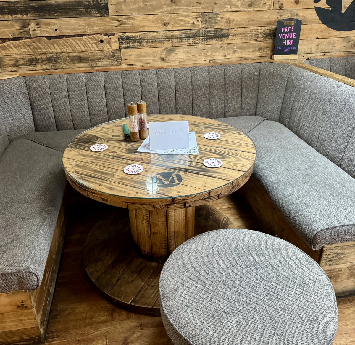 Walking inside, we were greeted warmly at the bar and then taken over to our table; the centre one of a trio of circular booths along one wall. If you ever get the chance to sit at one of these, take the time to appreciate the up-cycled, glass-topped table that’s fashioned from a massive cable reel – it was pretty impressive, I must say. The Marquis Pub and Kitchen is an open-plan space, but there’s lots of ‘areas’ to dine in, and the squishy chairs in front of the log-burner are just begging to be relaxed in.