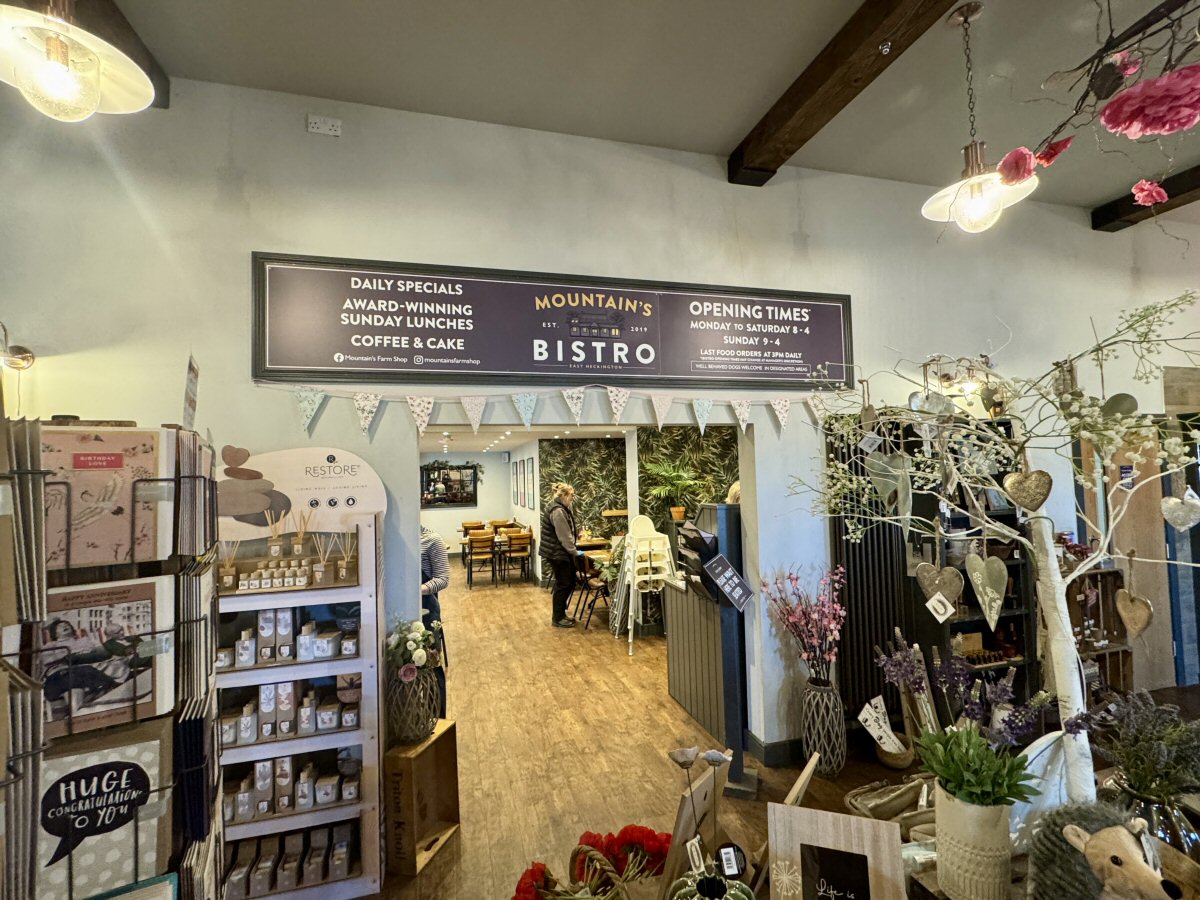Sunday morning saw us packing up our things in readiness for coming back to the ‘Shire and, as is their usual habit, TBW and The Man were doom scrolling music and food, respectively. His Nibs came up trumps with somewhere for us all to go and indulge in a proper slap-up brekkie, and it’s a place right on the A17 that we have passed many, many times! Mountain’s Farm Shop is way more than its title; it’s a café/bistro, a farm shop, a gift shop, a butchery, and even has a dedicated takeaway/on-the-go food shack called ‘Feast’.