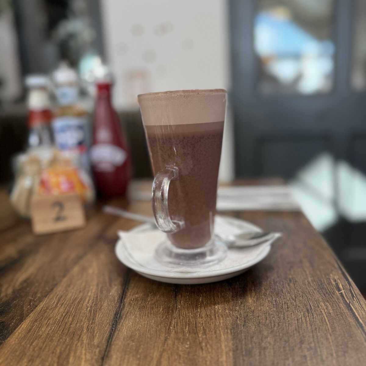Wandering through the gift shop, we made our way to the welcome ‘desk’ where we were greeted warmly by a young lady who checked our reservation and then took us to our table. The area where we sat was an extension to the original seating and was in the bright, airy style of a barn conservatory; think, pale walls, high ceiling with decorative beams, lots of Velux windows to allow the natural light to flood in, and hand-painted country creatures and dogs at floor height. Menus were already on the large wooden tables, so we studied those to see what we fancied for refreshment: 3 ‘naked’ Hot Chocs, 1 fully-blinged Hot Choc, and 1 Flat White Coffee.