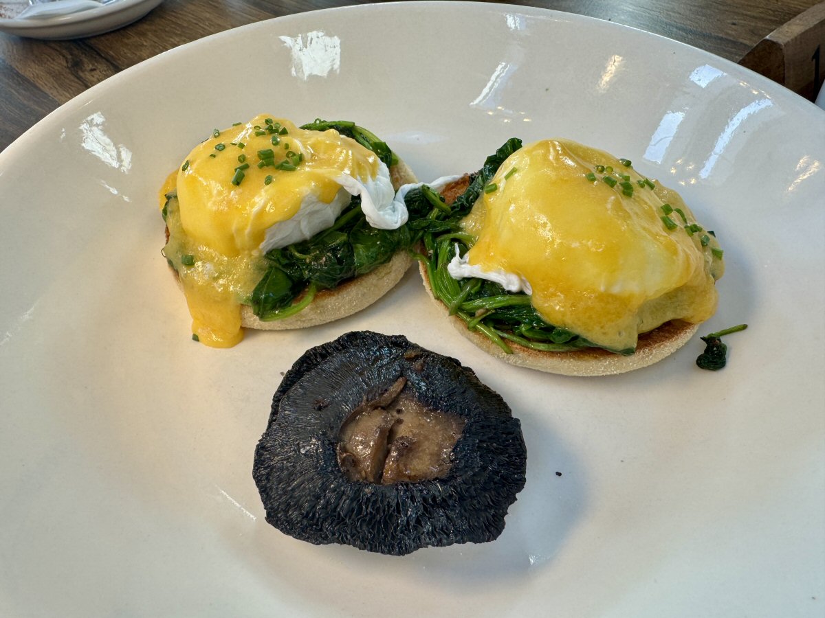 Our server was the loveliest lady, and had a good natter with us as she was taking our food order – always nice when a team member takes the time to get to know you a bit better. I had spotted the Eggs Florentine (£9.50), so ordered those with an extra portion of Mushrooms (50p);Ginger Ninja chose a Bacon [and fried Egg] Sandwich on White Bread (£5.95, egg 75p extra), and the other three all went for the beloved British choice of a ‘Full English’ (£12.50). Except, as usual, the order wasn’t that simple! His Nibs wanted to add on extra Hash Browns (£1.50 for 2), and the rather intriguing-sounding ‘Brunch Slice’ for £1 extra; TBW and BB fancied more poached eggs, so ordered those (75p each). The Full English also comes with your choice of Brown or White Toast, so it’s a belly filler.