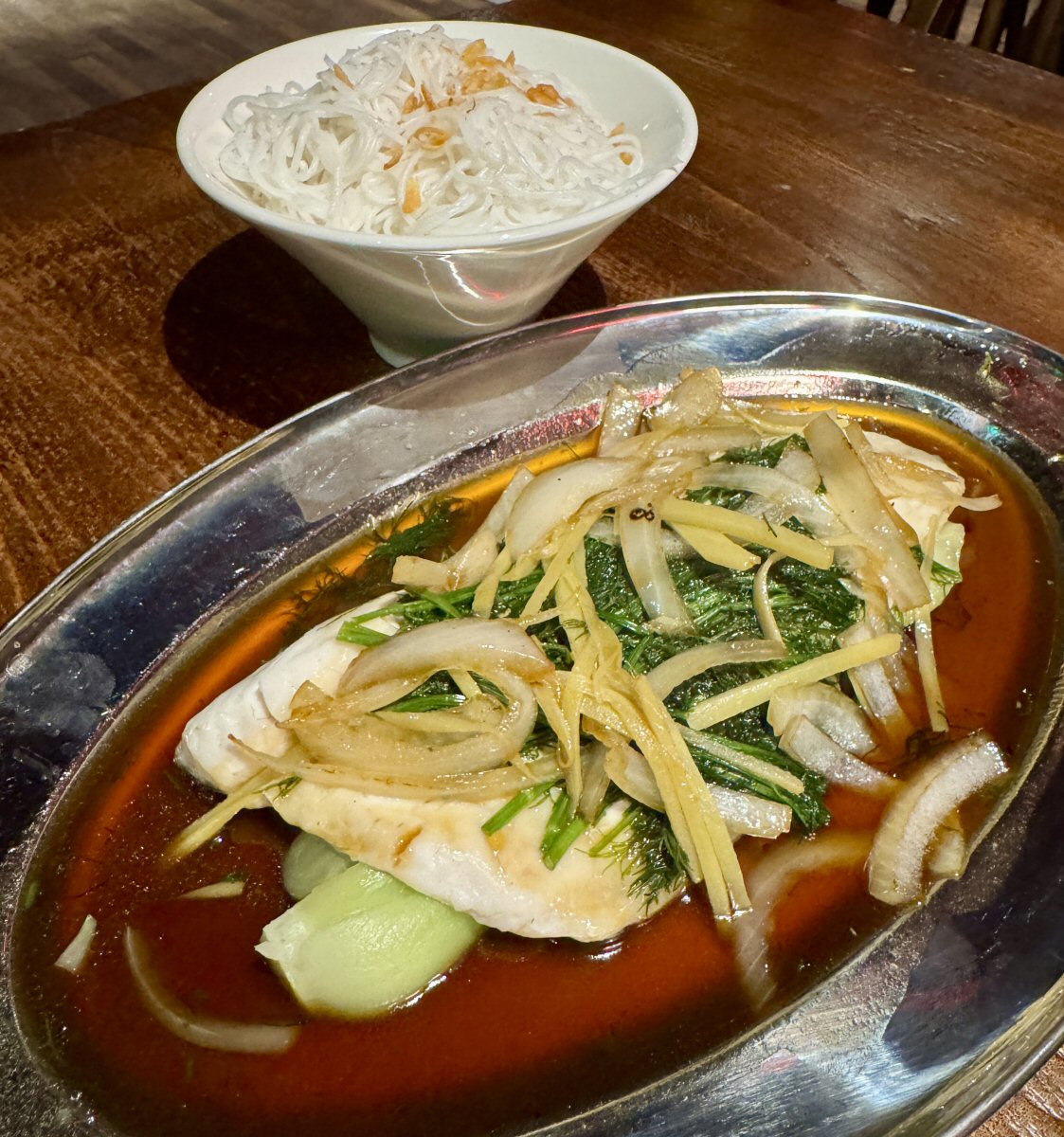 My original order had been for the Turmeric Fish Platter (from the ‘Specials’ section) but this was sadly unavailable, so I switched to the Steamed Fish (Sea Bass, £16.80, and also from the specials selection) that comes with pan-fried Pak Choi and a humungous amount of wilted Fennel Fronds, julienned Ginger Crisp, and a liquor of Soy Sauce and Scallion Oil. Flavours exploded in my mouth, blowing my senses completely. No word of a lie, I can’t honestly remember having fish that has been cooked as expertly as this! Sublimely soft and sweet, the flesh melted on my tongue and I could literally feel the moistness melting away as I bit into it. Like the noodles in His Nibs’ Pho, the Sea Bream seemed to welcome the spices and herbs it had been cooked with to its bosom (or should that be fins?!), taking on their hints throughout. An abundant warmth from the Ginger made its presence known to my palate, accompanied by the delicately anise taste of the Fennel fronds. Quartered Pak Choi was gently grassy and cooked absolutely spot-on: wilted at its leaf tip, and beautifully crunchy at its base.