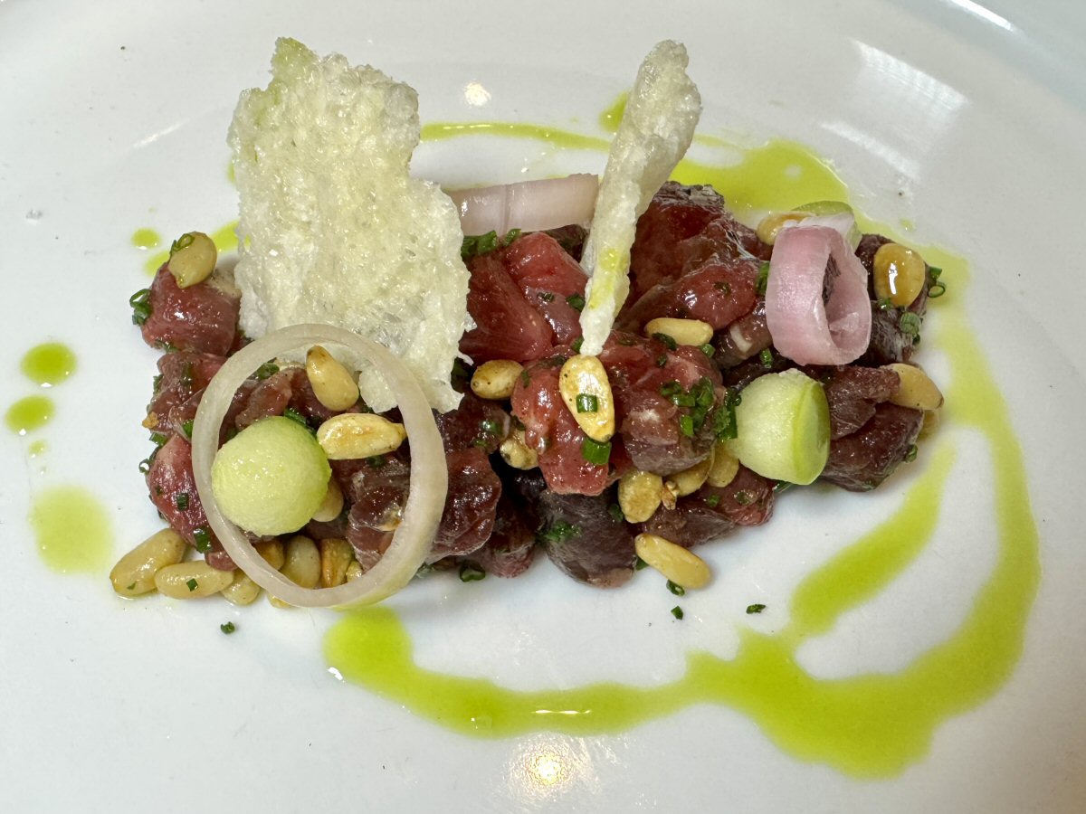 The Man Bird was impressed with how soft the pieces of Beef were in his mouth, and they were super-tasty, too. Tiny spheres of crisp Apple were deliciously sharp, pinging against the creaminess of the Pinenuts. Both the pickled Shallot and Parmesan Crisp provided stark contrast to the sweet, mellow Beef. Many folks are put off by the fact that Beef Tartare is raw Beef, but the texture is divinely velvety and acidic, sharp seasonings such as Shallot, Capers, Dijon Mustard and Worcestershire Sauce/Hendo’s (Anchovy-free) are used to make this supremely tasty dish. Once you’ve tried it, you’ll wonder why you didn’t sooner.
