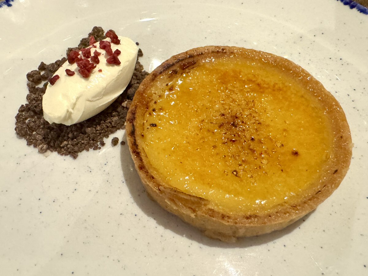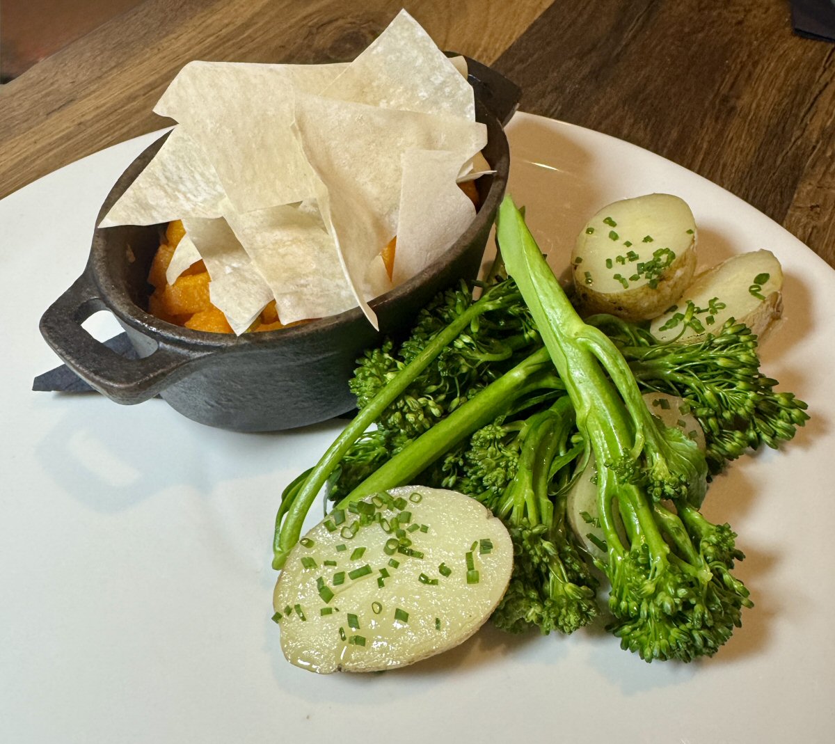 My Butternut and Sage Filo Tart was served in a poker-hot, cast-iron pot, with the shards of pale Filo providing the ‘crust’. Underneath this crunchy cover was a sunset-toned ‘filling’ of softened Butternut Squash, and I certainly appreciated the contrast in textures and colour. I also liked the fact that Chef had kept the seeds of the Squash in, and my palate picked out their nutty tone from the sweet, comforting flavour of its Butternut parent. Personally, I would’ve liked a more robust amount of Sage coming through in my mouth, but that is purely my subjective opinion; someone else may say that, for them, the herb level was spot-on. Continuing the nutty taste of the seeds were the sweet, Jersey Royal potatoes that are coming into peak season right now. For someone who isn’t a particularly ardent spudophile, I will admit to absolutely relishing Jersey Royal season. Tenderstem Broccoli was still nicely firm to the bite and its nutty, sweet taste complemented its potato cousin wonderfully. Adding a lovely allium bounce were the finely chopped Chives that had been added for garnish. This was a surprisingly filling dish, and I enjoyed it way more than I initially thought I would.