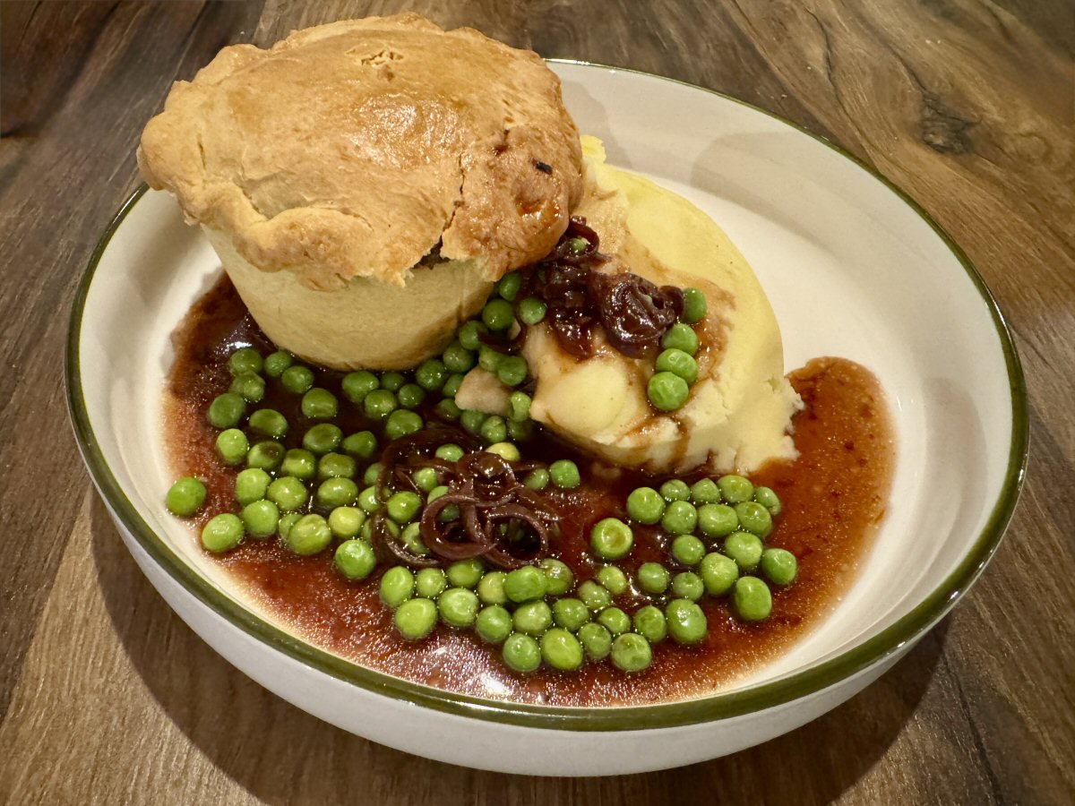 For mains, we ordered the Pie of the day (Lamb on this occasion) with Mash and Garden Peas, rather than Chips and Veg, and Gravy (£17), and Butternut and Sage Filo Tart with Jersey Royals and Seasonal Greens (also £17) for His Maj and I respectively. As with our starters, the food was beautifully presented and certainly ample in portion size which, I have to say, my dish didn’t look to be at first glance.