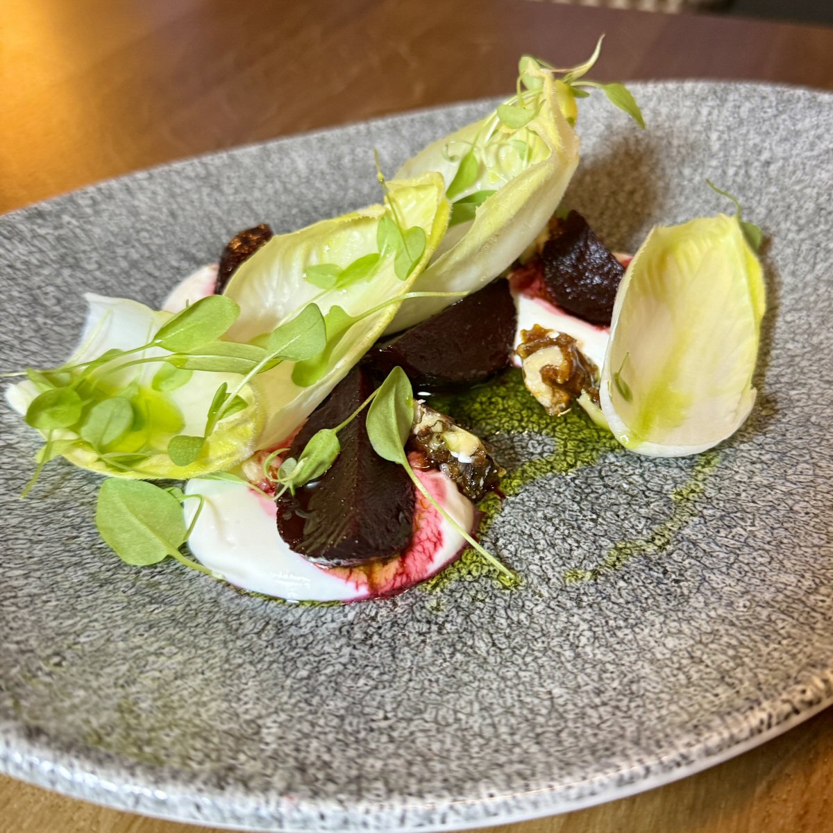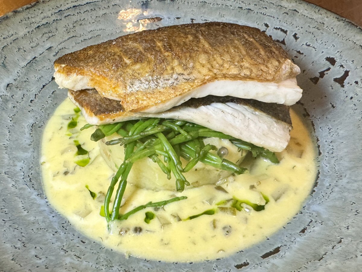 Having been so impressed with our tasty first course, we were like proverbial cats on hot bricks in anticipation of our mains! Thankfully, we weren’t waiting overly long and plates of Sea Bass (£29) and Derbyshire Lamb (£33), along with an additional side of Seasonal Vegetables (£6.50) were soon being savoured. My plate contained a pair of sizeable Sea Bass Fillets (from our friends at RG Morris in Buxton) that were perched on a round of crushed New Potatoes. The fish was utterly glorious; its delicate sweetness washed over my tongue with its firm, meaty texture lingering long enough for my senses to register it before the flakes melted. Bringing a hefty zhuzh of flavour were the nuttily flavoured, perfectly seasoned New Potatoes and an obscenely good Tartare Beurre Blanc that blended tangy Tartare sauce with the notes of Shallot, White Wine and Vinegar in a silky emulsion. Ozonic hints and crunch-a-plenty came from the verdant fronds of Samphire, whilst Lemon and Herbs added a pleasant ping on the palate.