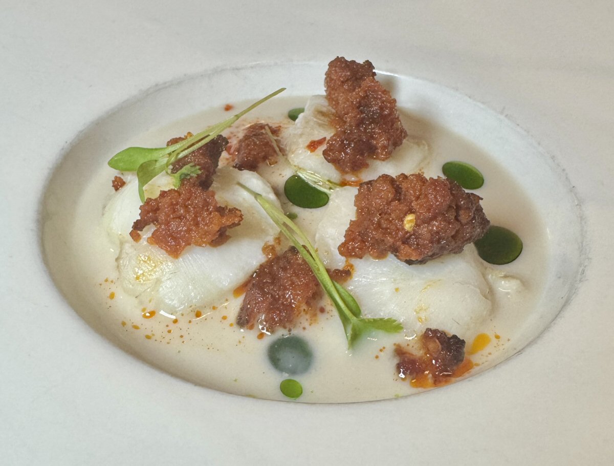The Cod Cheeks themselves were gorgeously soft and scallop-like, their gentle sweetness wafting over The Man’s tongue. In complete contrast, the Calabrian Nduja that had been crumbled on top of each cheek, swaggered in like Legend the Gladiator (aka Matt Morsia), dropping its boldly smoky, Chilli heat taste on the palate with no apology whatsoever! Now, you might be expecting me to say that the Nduja over-powered the Cod, but it didn’t; used judiciously, the small amount of sausage provided just enough intensity to inject depth of flavour, leaving the subtler, lighter tones to its piscine partner.