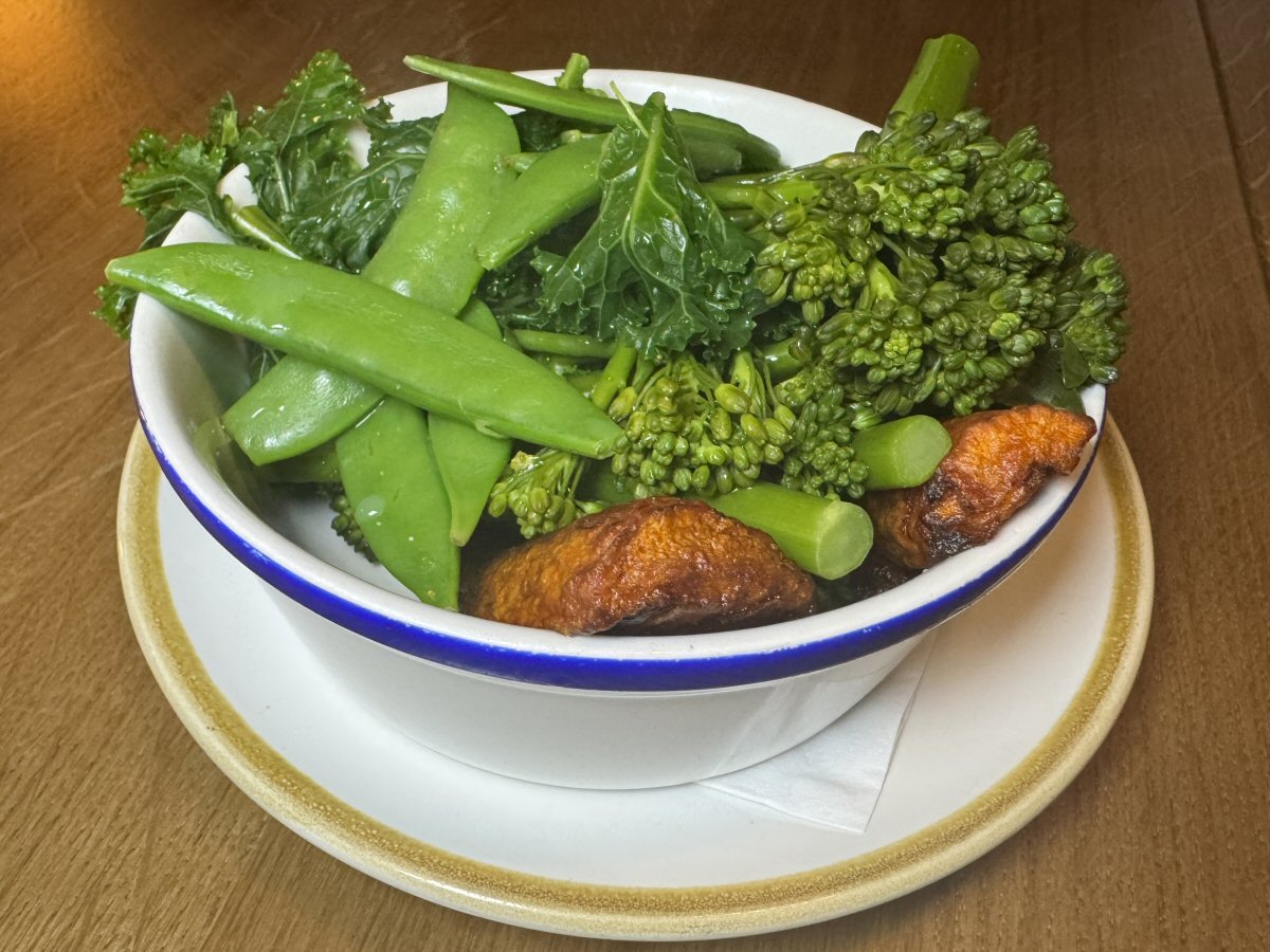 A bowl full of fresh, in-season vegetables certainly provided all the taste you could wish for: softened, roasted Carrots and Sugar Snap Peas brought their beautiful sweetness, whilst still-crunchy Kale and Broccoli brought more savoury, grassy notes. All were lightly glossed with butter for an attractive presentational touch.