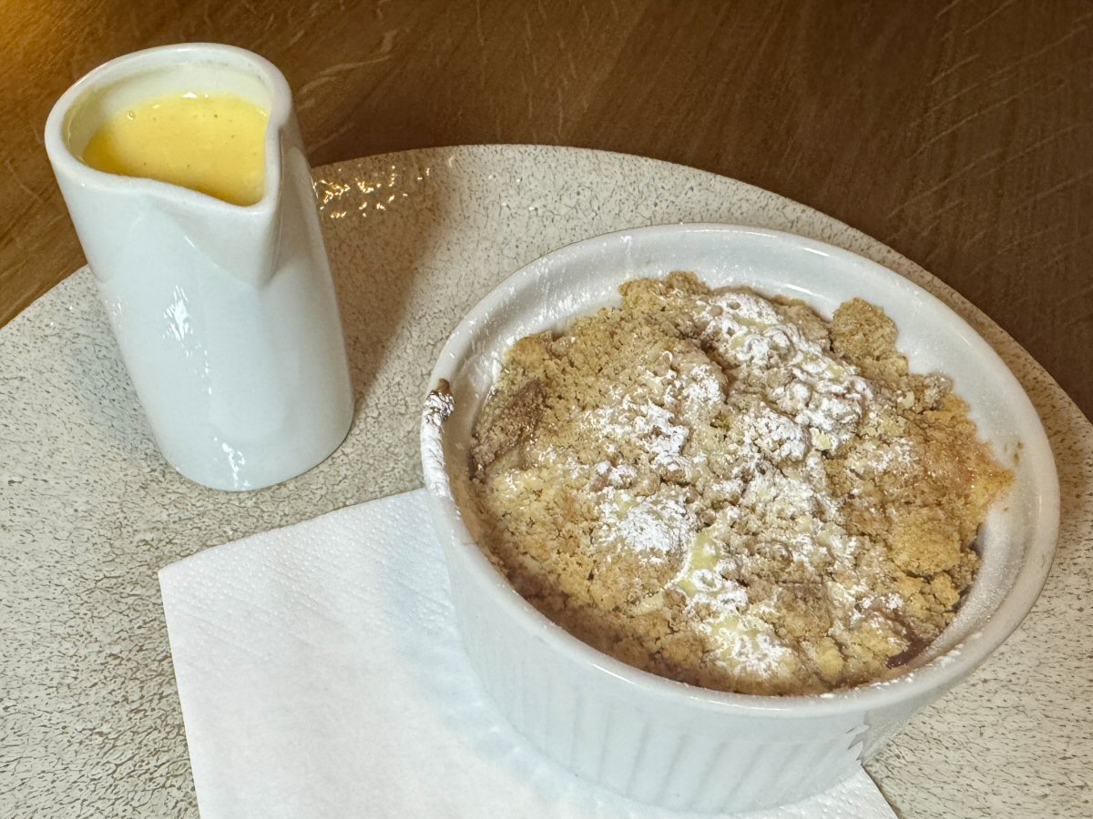 There’s a well-known saying: ‘It’s the quiet ones you need to keep an eye on’, and this certainly applies to my seemingly simple pudding choice. Like most things, when done well, there is no finer sweet treat than at-its-peak fruit and rich, buttery crumble topping. At The Beeley Inn, Chef and his team have their craft down-pat; all three fruits were cooked to perfection and I savoured the softened chunks of Pear and Apple, my taste buds picking up on the faint graininess of the fragrant Pear. The Rhubarb had cooked down to its individual strands, providing thickness to the compote-like filling, and I was pleased to discern that the fruit hadn’t been sweetened, leaving this facet to the crumble. Vanilla-laden custard was provided in a separate jug and it brought a wonderful roundedness to the pudding.