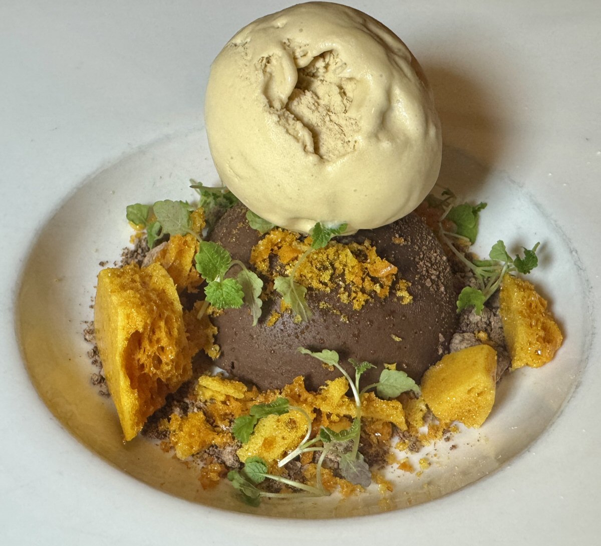 Chocolate Marquise sounds exotic, doesn’t it? Well, let me just say that it is every bit as sumptuous as it sounds; dense, velvety and indulgent, the palate picks up on the generous cream and butter content, followed by the protein-heavy egg, and then the pleasure-centre hitting Dark Chocolate and Cocoa Powder. Subtlety and restraint are most certainly not in this dessert’s vocabulary, but satisfaction and pleasure definitely are. The high cocoa content of the chocolate lent a beautiful bitterness to this dessert that was needed to counter the concentrated sweetness of the gooey-centred Honeycomb. Just to supply more luxuriance because, y’know, it was needed (!), the creamy, rich Salted Caramel Ice Cream threw its hat into the ring. Possibly remembering that some semblance of control was needed, Chef garnished this morsel with micro-Lemon Balm, which brought a joyous citrussy bounce to cleanse the palate. Completely marvellous, that’s all His Nibs could say.