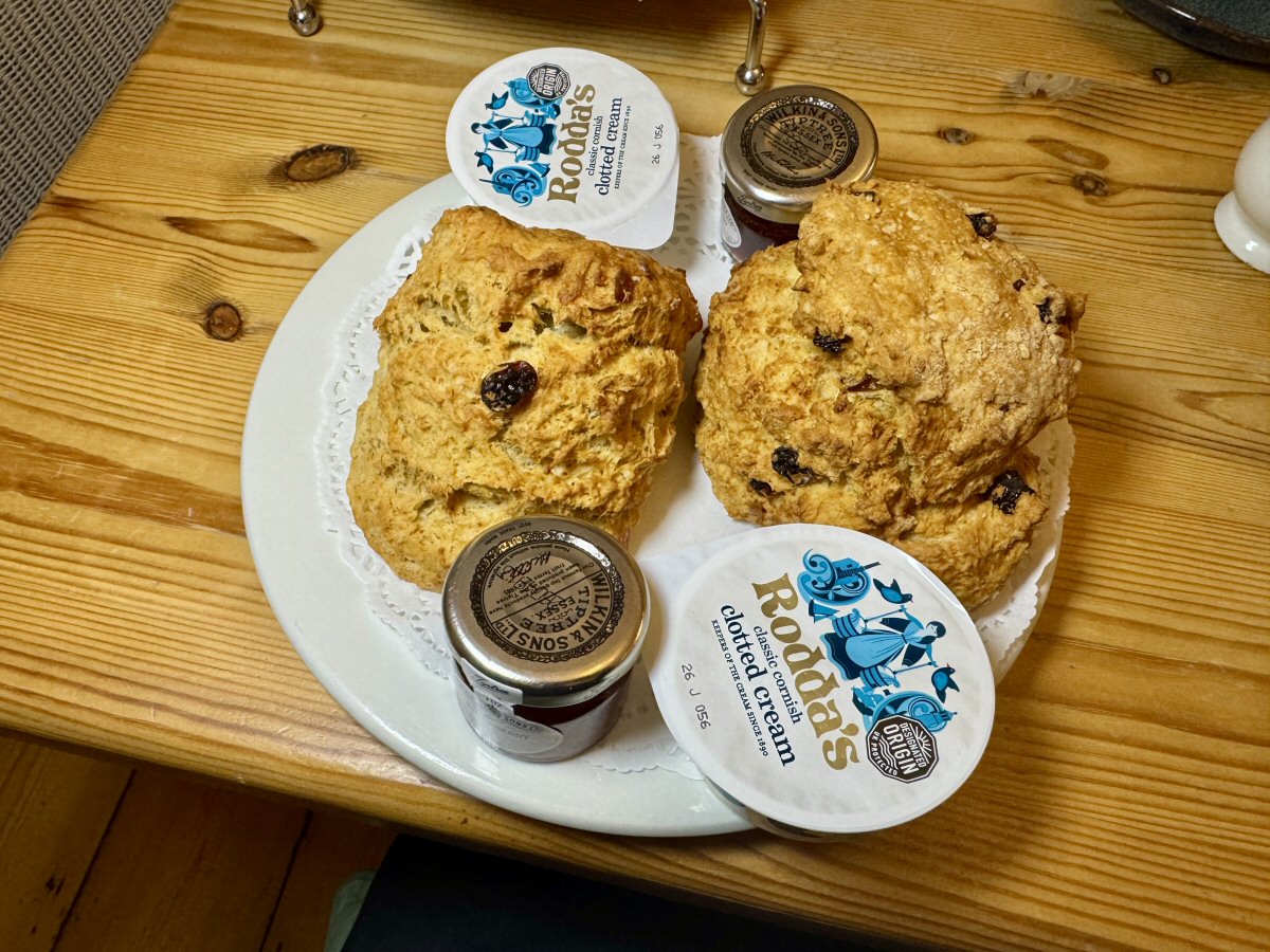 Every time (and I do mean EVERY time!) we have Scones, does he start winding me up about whether the cream or jam goes on first. In all honesty, I don’t really give a fig; the only thing that matters to me is not ending up with a smudged, Raspberry Ripple effect. Certain melded foods give me the ick, and Cream and Jam is one of them; Egg Yolk and Baked Beans the other prime one – bleurgh. So, I cracked on with popping the lusciously thick Rodda’s Clotted Cream on first, watching as His Nibs deliberately spread his Strawberry jam on as the bottom layer on his Scone. The unctuous jam sat proudly on top of the Cream, not disturbing it at all, which made me smile with contentment…and I smiled even more when that glorious combination of buttery Scone, silky Cream and fruity Jam all swirled in my mouth.